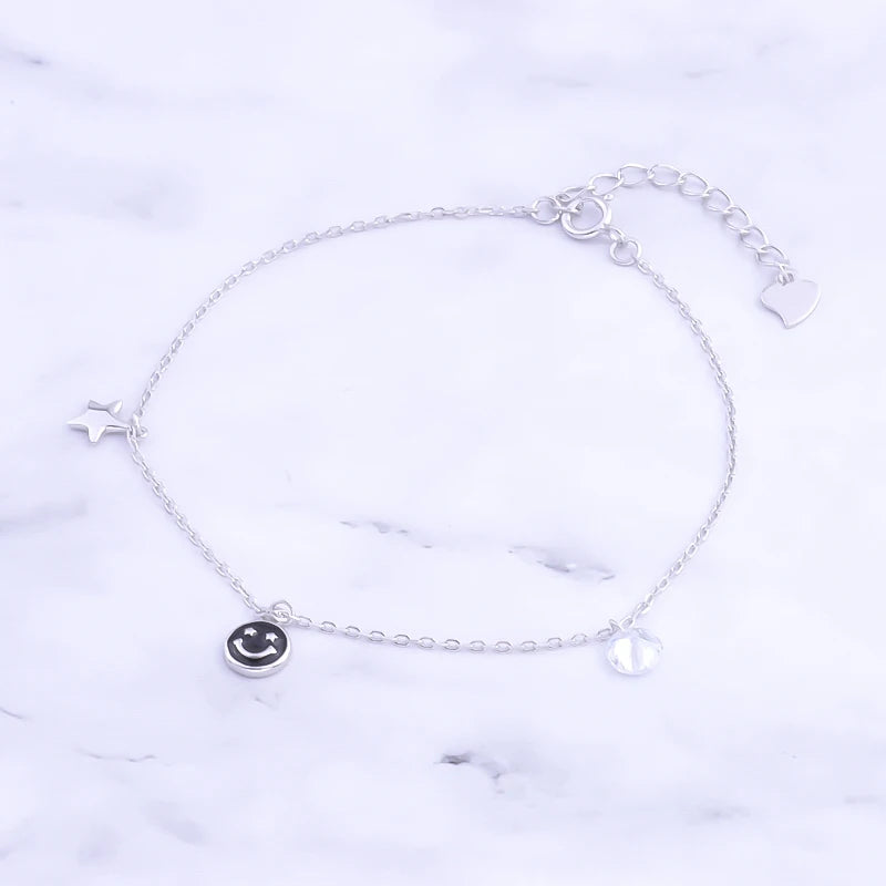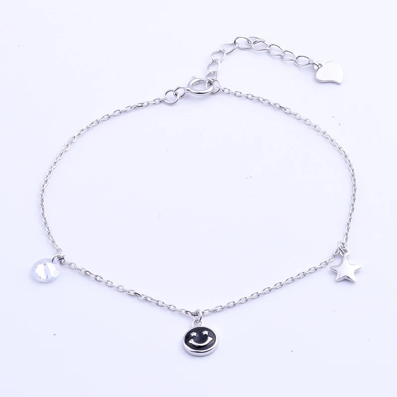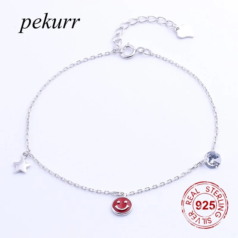 - 925 sterling silver bracelet with CZ gems, star, and red smile design