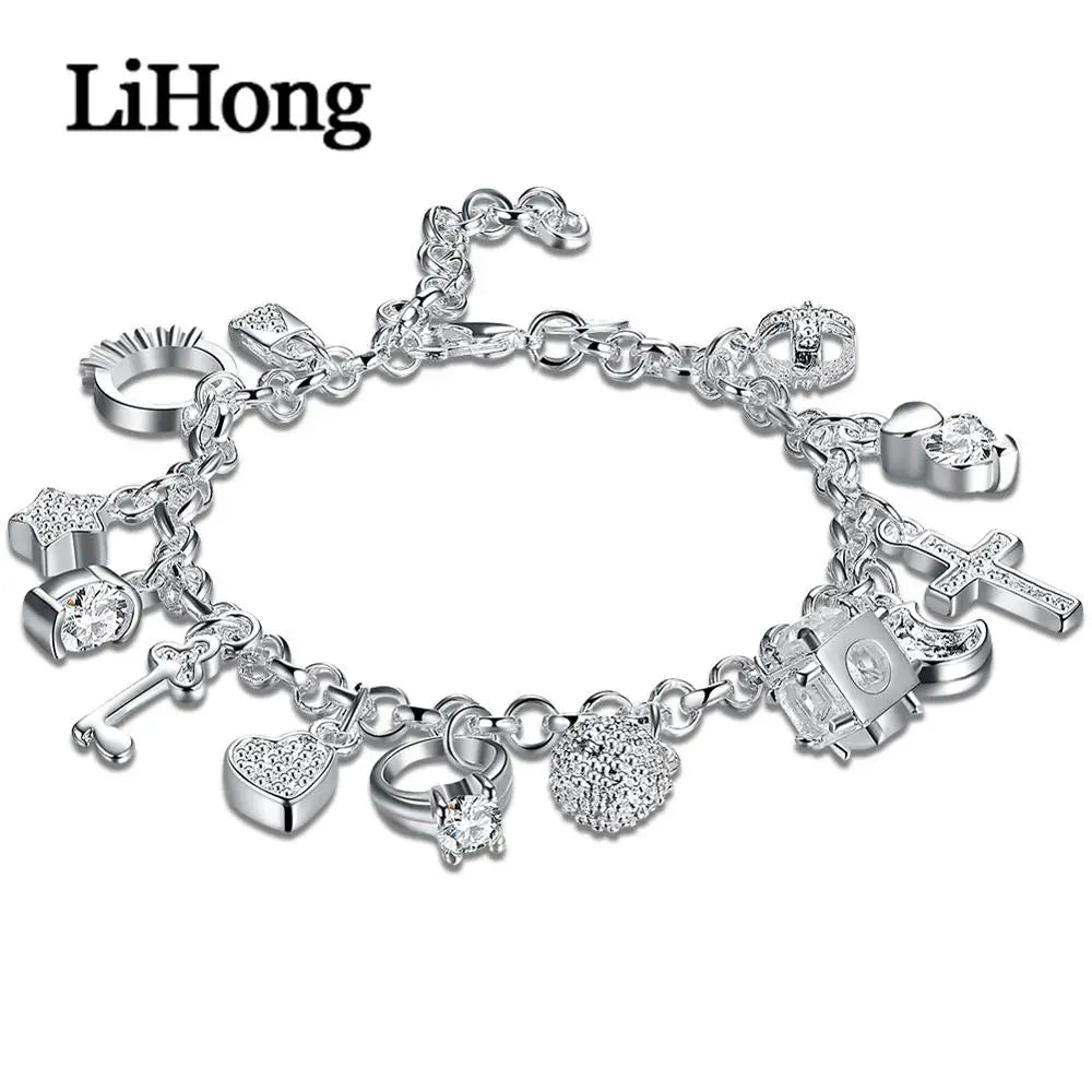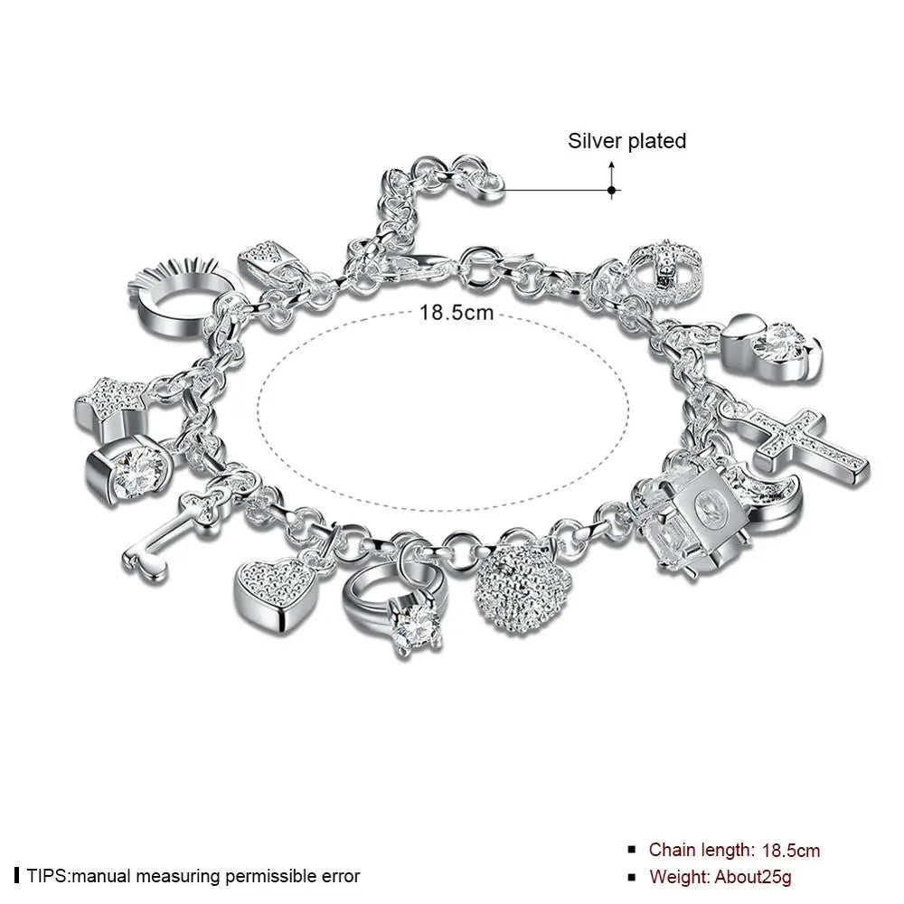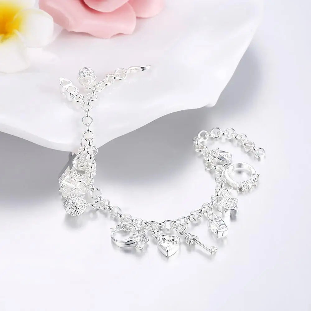 925 Silver Bracelet Moon Heart Lock Cross Charm Par