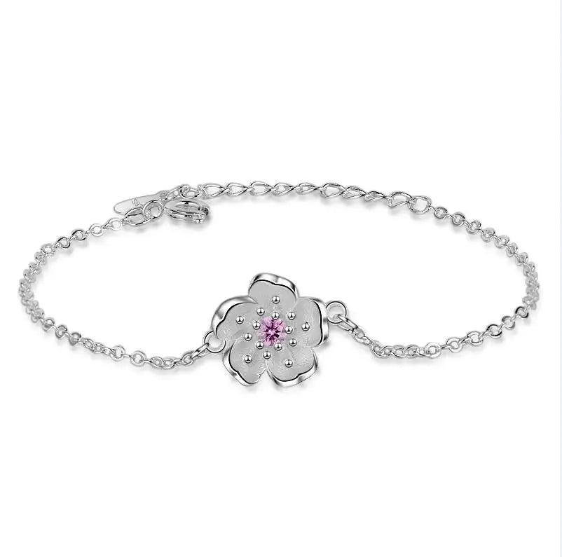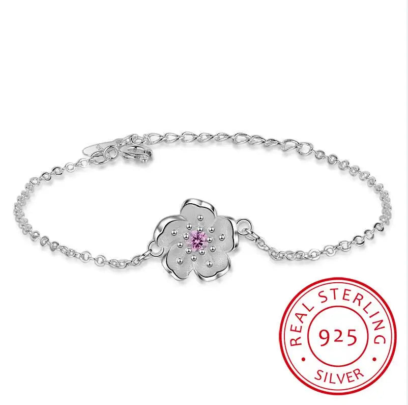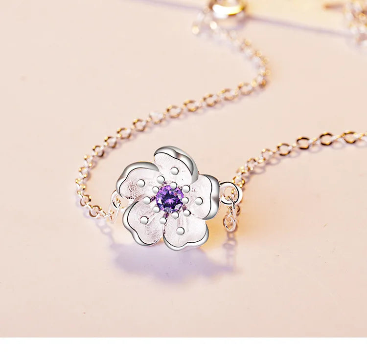 Stunning 925 sterling silver bracelet featuring purple and pink zirconia plum blossom flowers. This elegant bracelet is perfect for women who appreciate delicate and feminine jewelry.