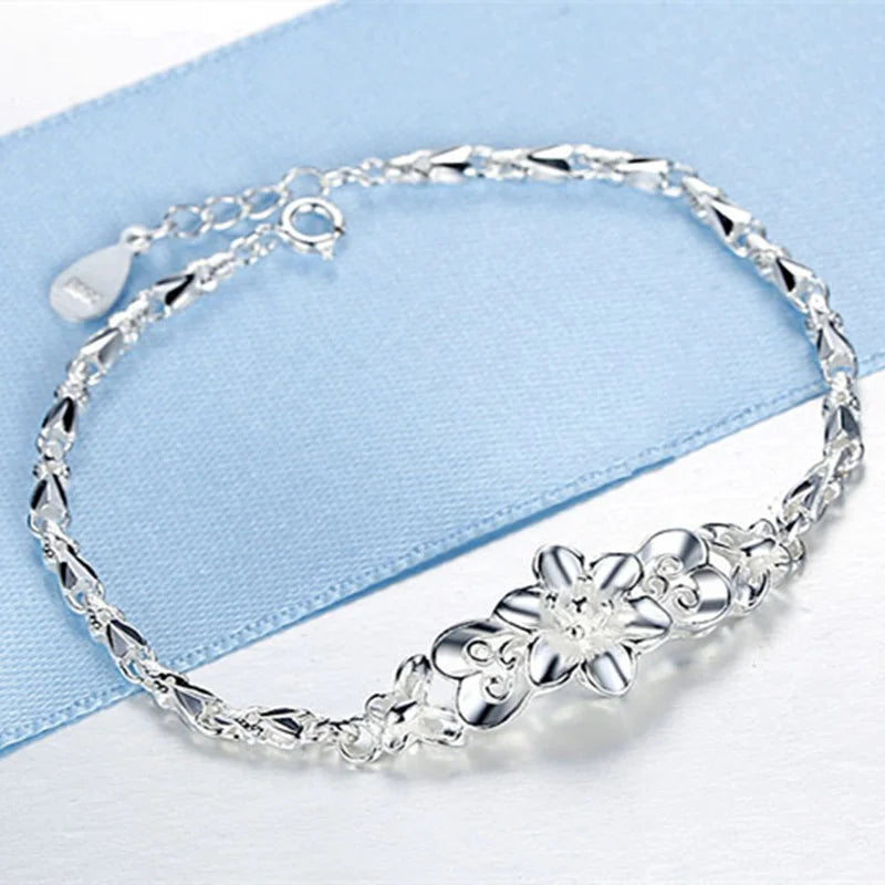 This stunning 925 sterling silver bracelet features a delicate flower chain design, perfect for weddings, parties, or as a gift for a special lady.