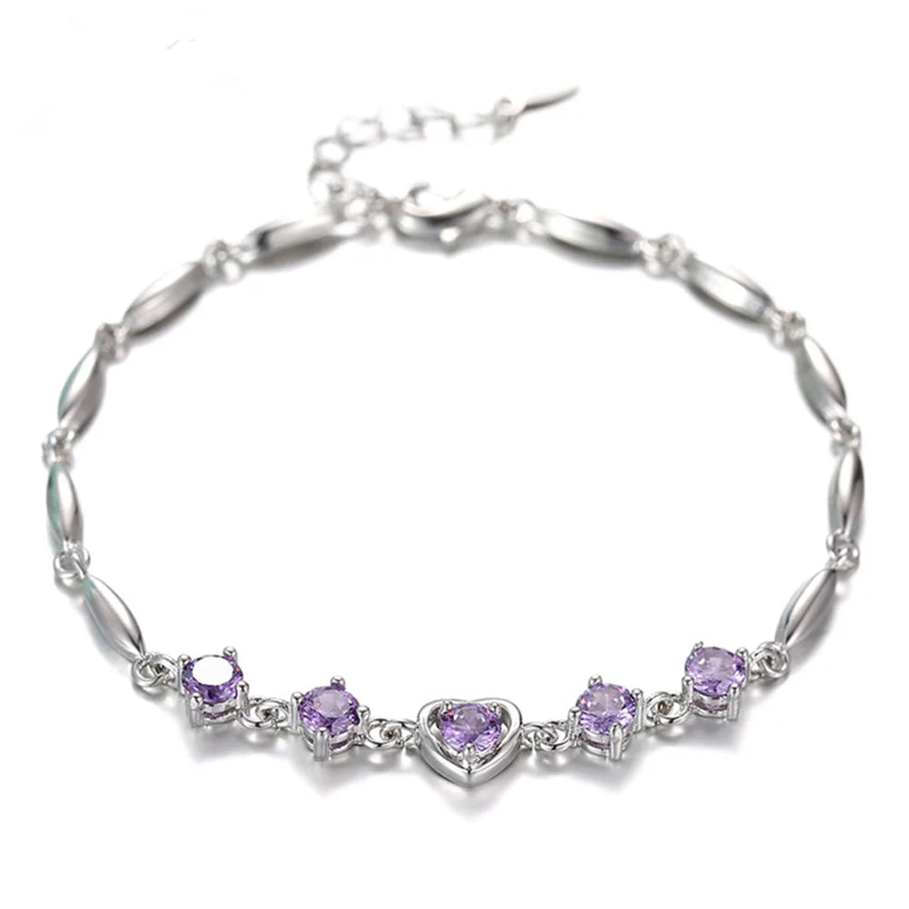 This sterling silver bracelet features a stunning purple crystal zircon, perfect for adding a touch of elegance to your look. Ideal as an engagement charm jewelry gift.
