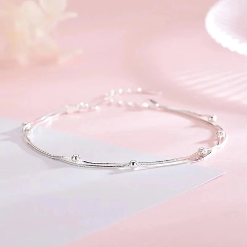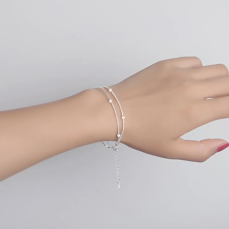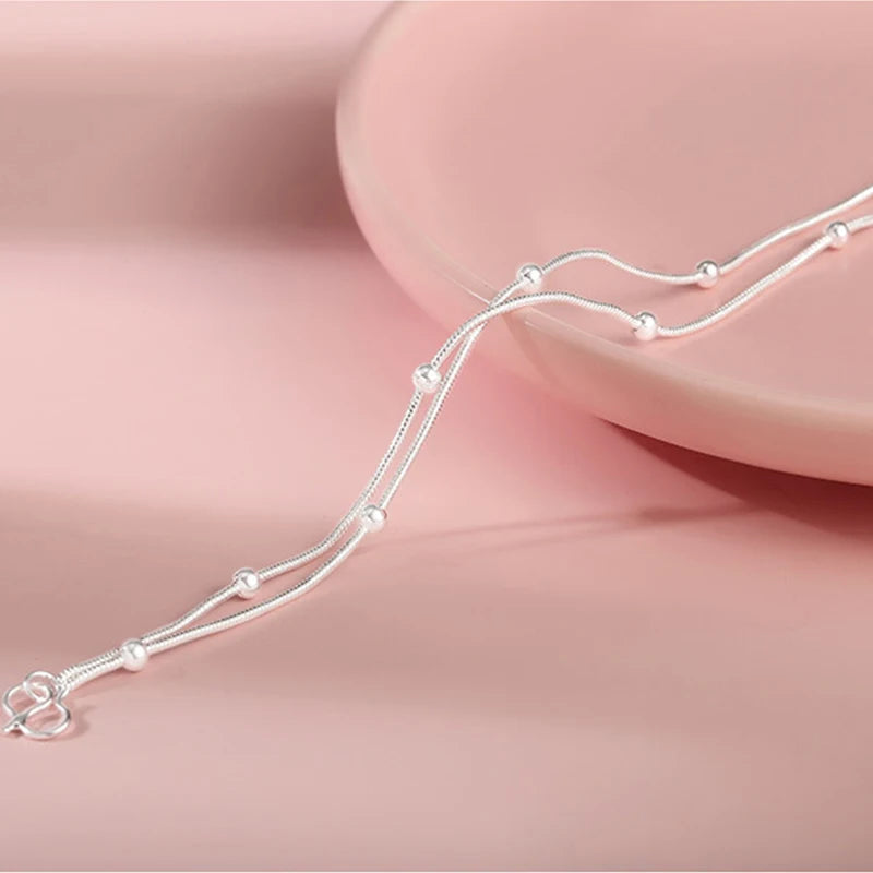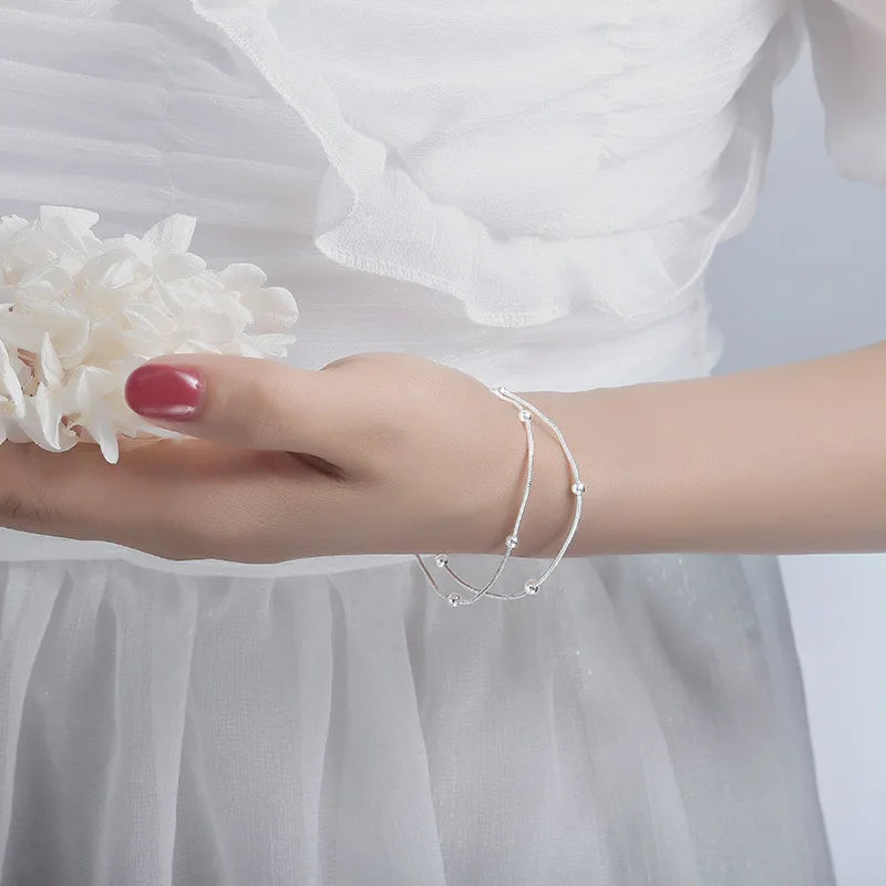 Elevate your style with this delicate double layer bead bracelet made of 925 sterling silver. The sparkling chain adds a touch of sophistication to your look. Perfect for any occasion, this bracelet is a must-have in your jewelry collection.