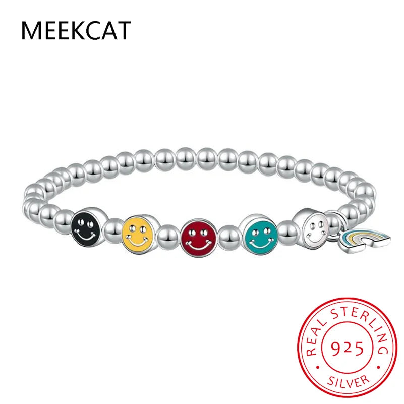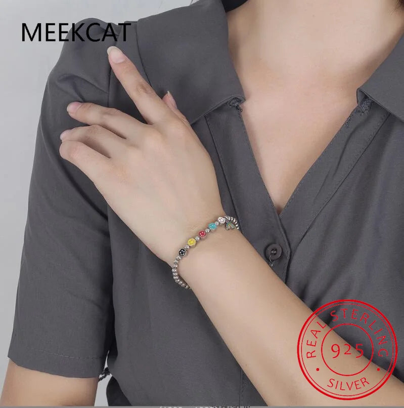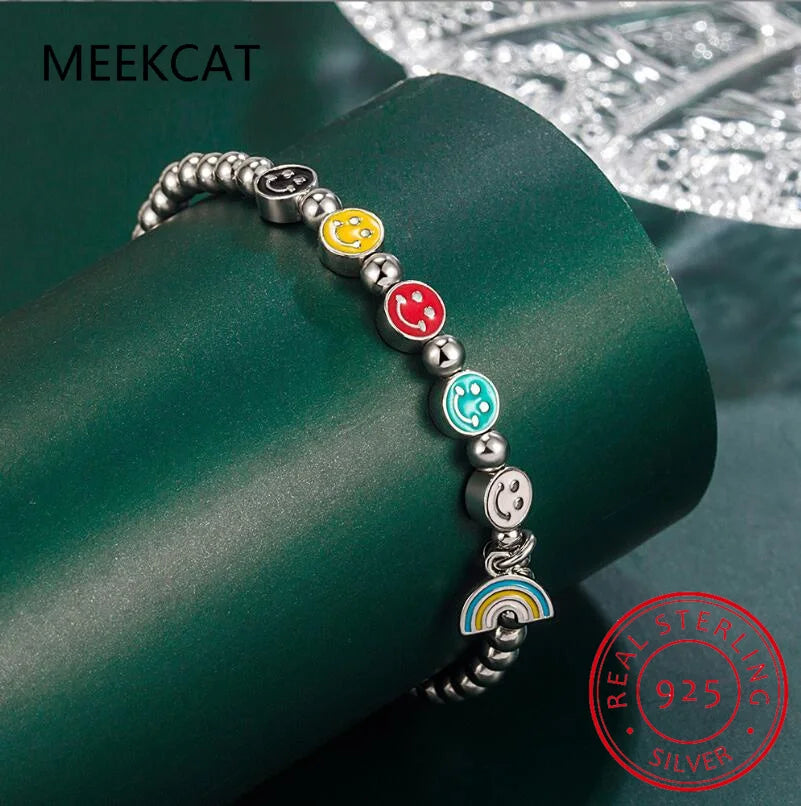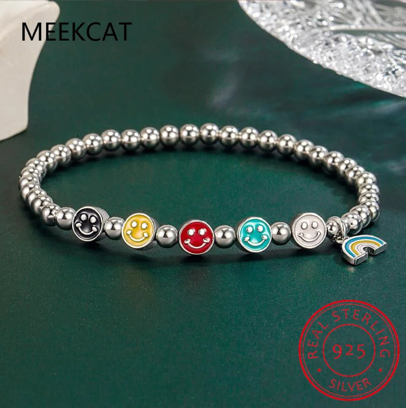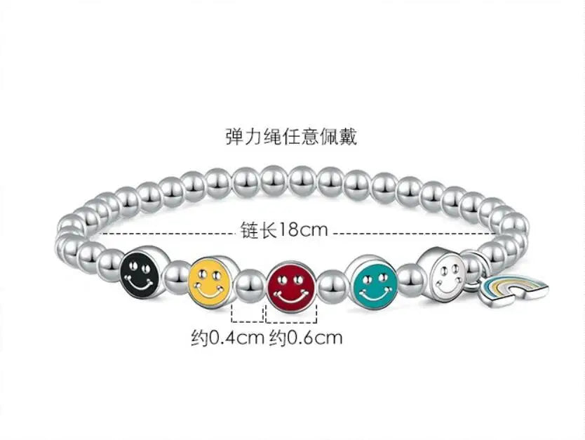 This sterling silver bracelet features a colorful rainbow smiling face design, perfect for women who appreciate fine jewelry. The bead chain adds a touch of elegance to any outfit.