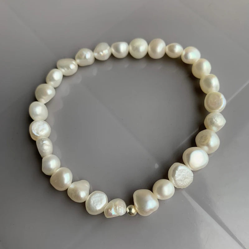 Adorn your wrist with this exquisite handmade baroque pearl bracelet featuring natural freshwater pearls and sterling silver charms.
