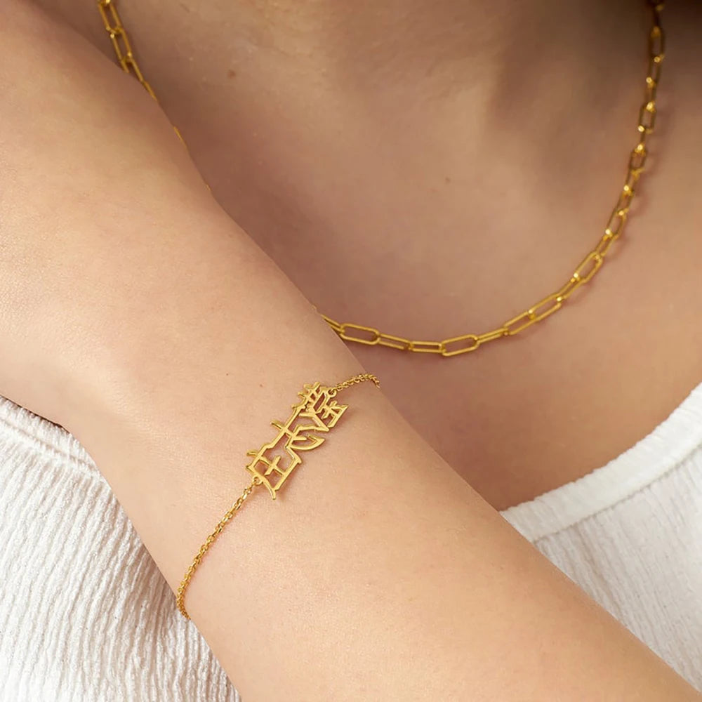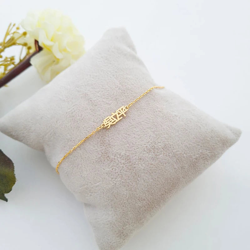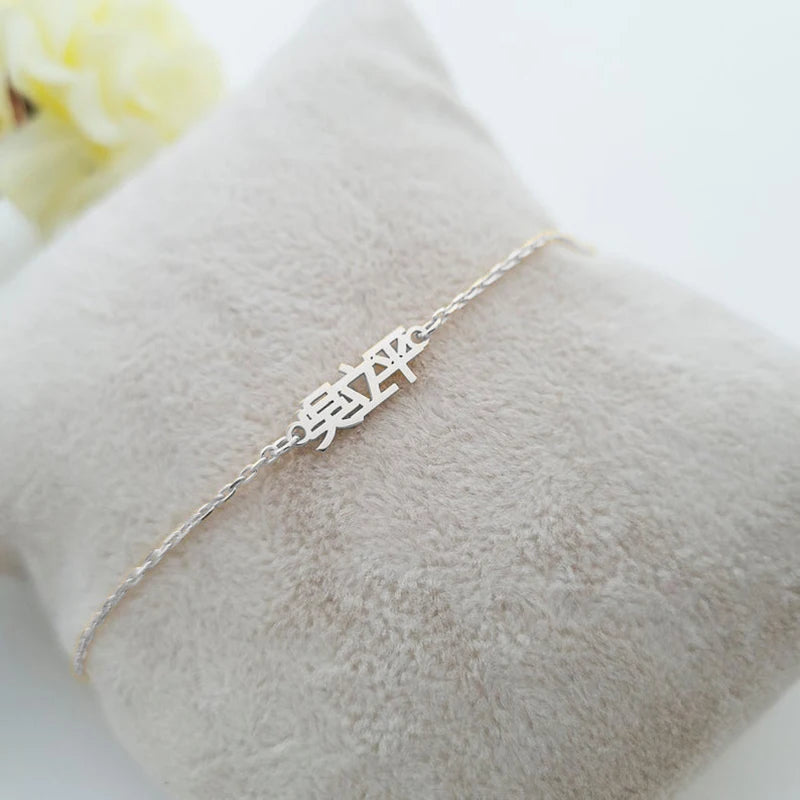 This unique nameplate bracelet is a perfect anniversary gift for women. Made of stainless steel, it features a Chinese pendant design.