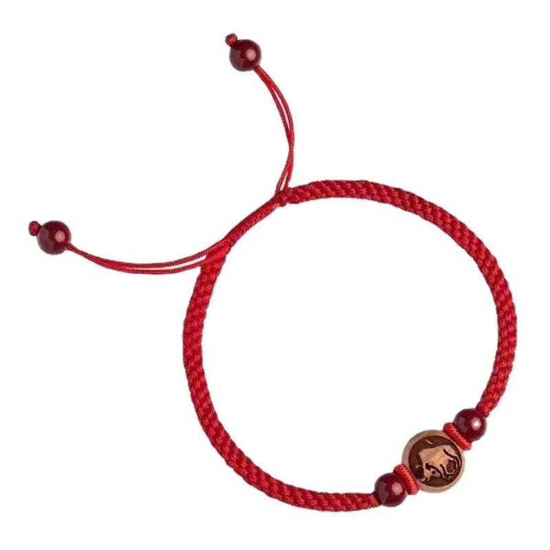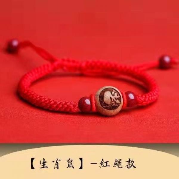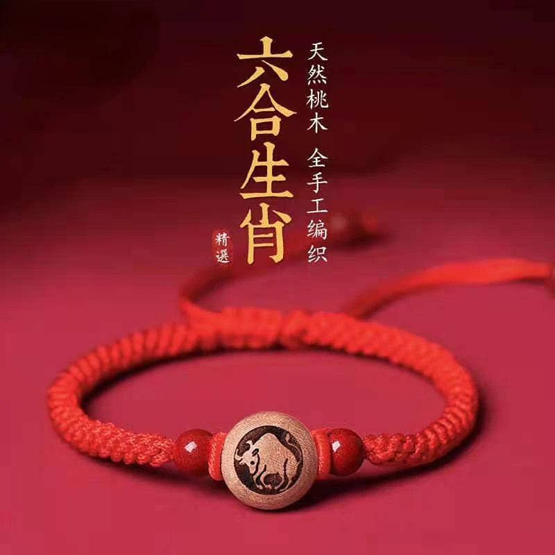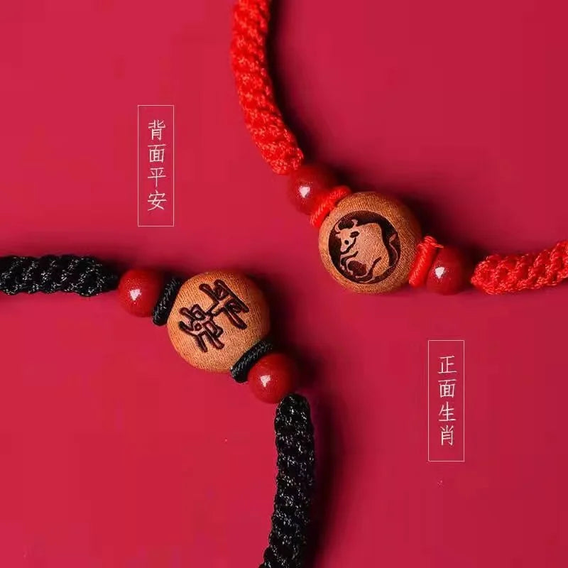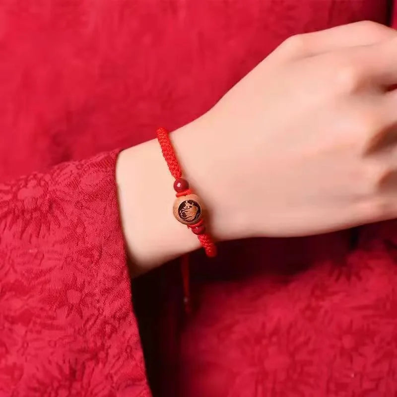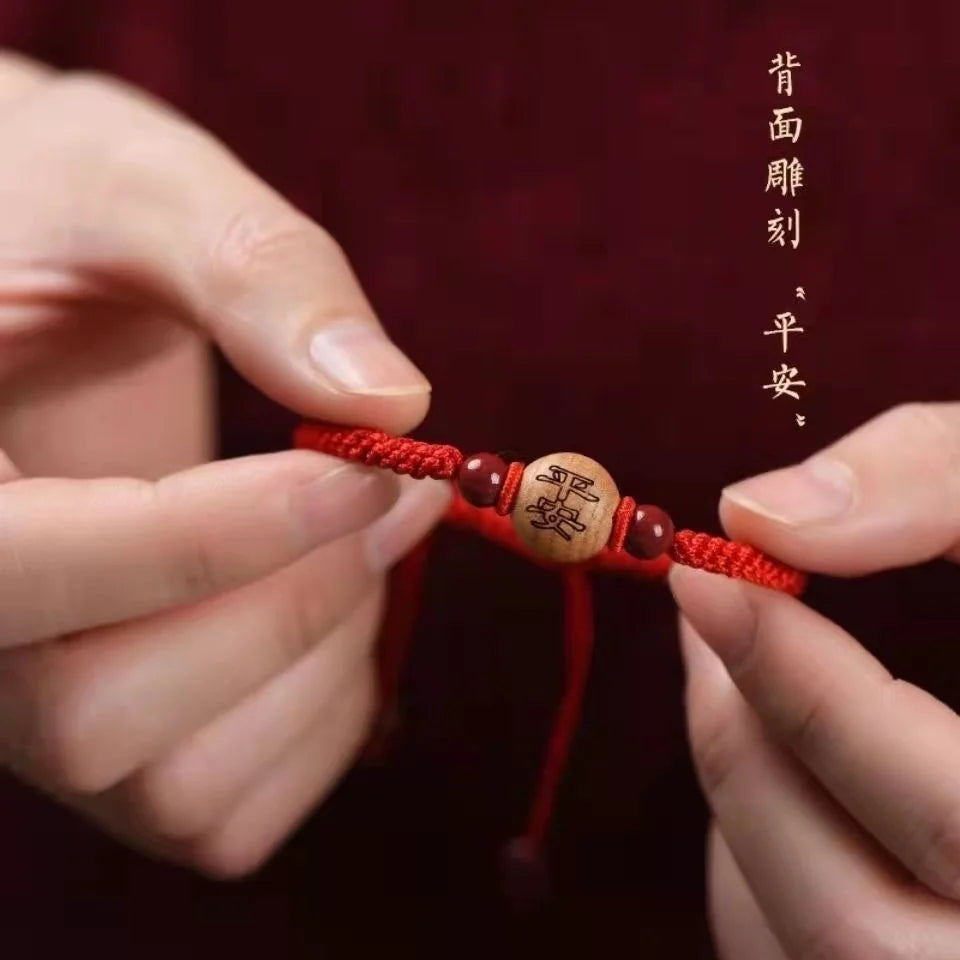 This bracelet is made of high-quality real peach wood with a hand-carved design. It features a natural cinnabar stone and red string. Perfect for women who love unique accessories.