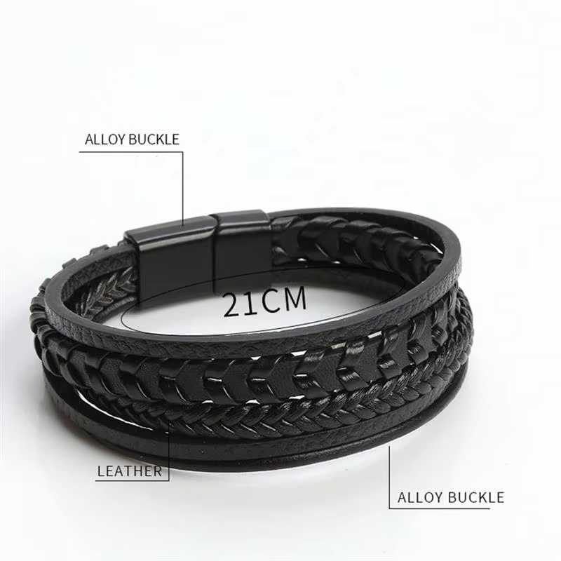 Men's Multi Layer Black Leather Braided Bracelet With Magnetic Closure