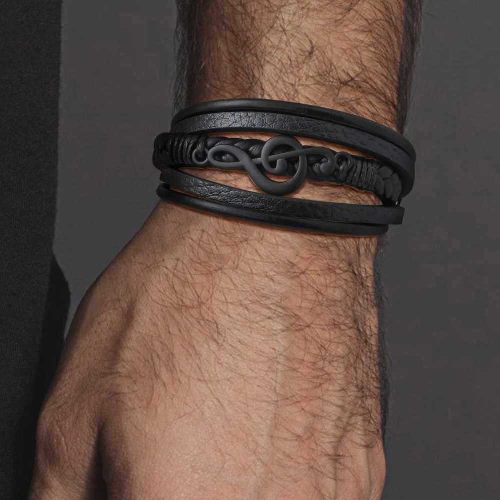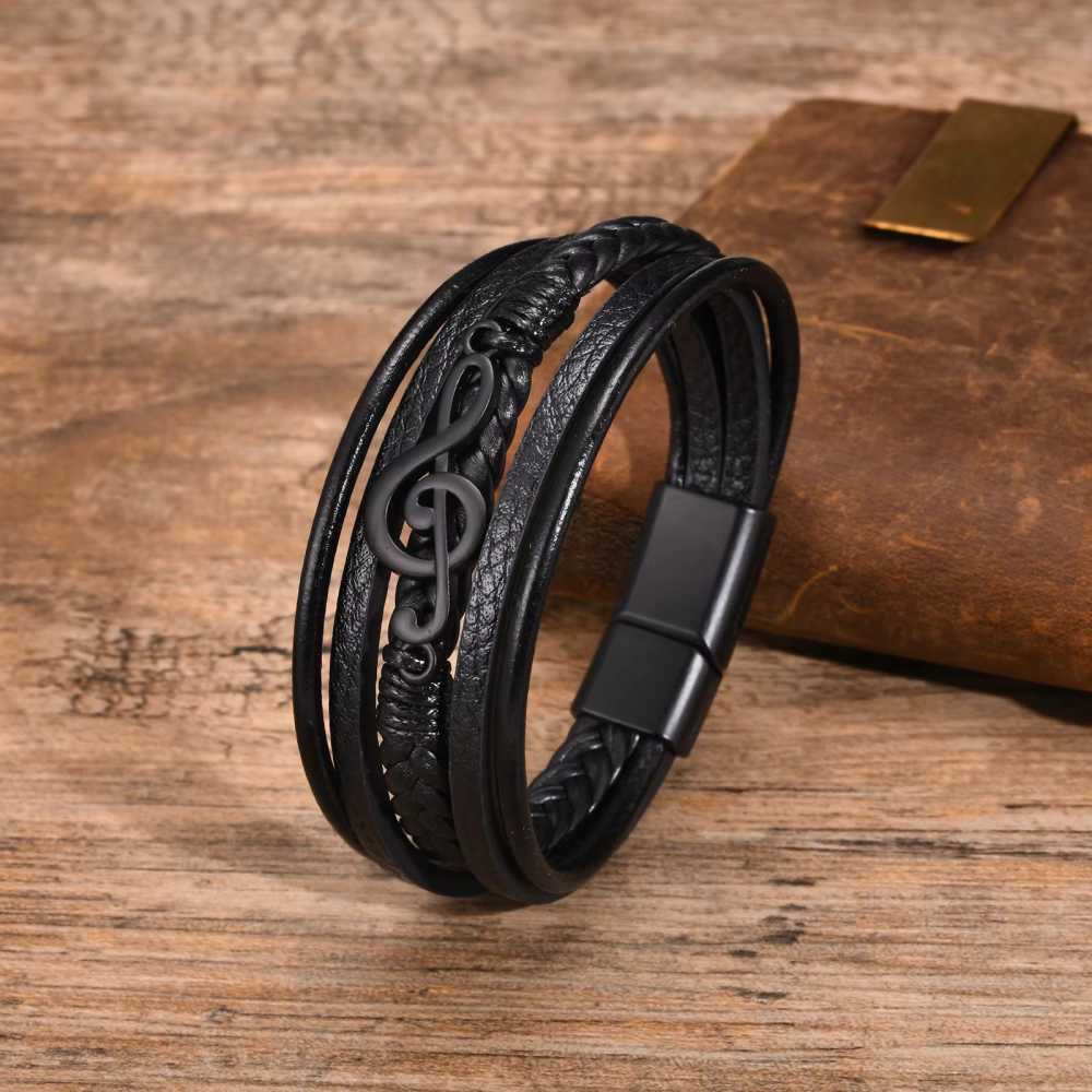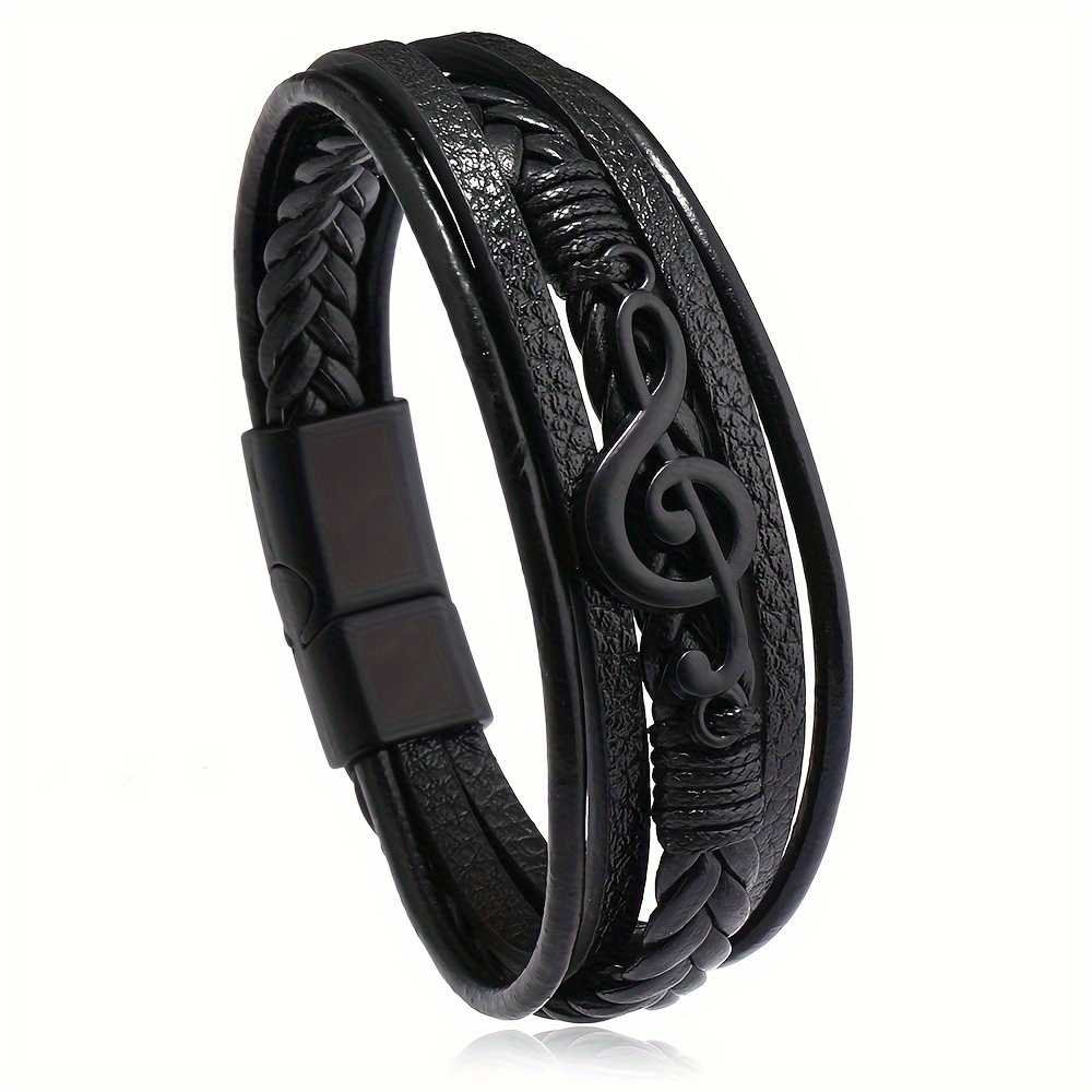Men's Multi Layer Black Leather Music Note Braided Magnetic Bracelet