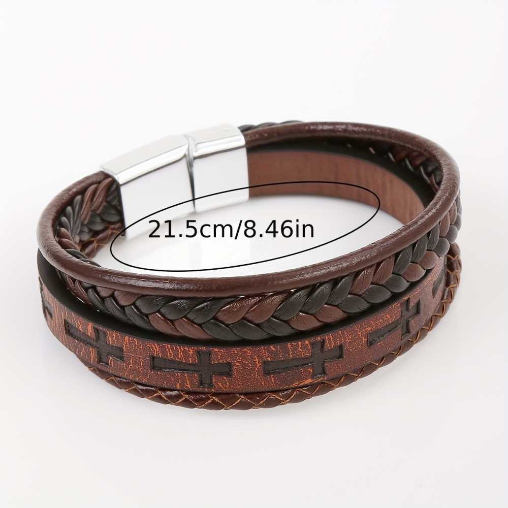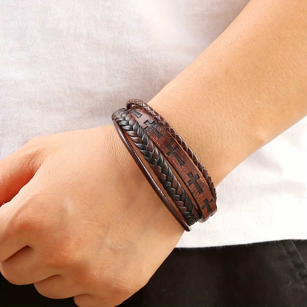 Men's Multi Layered Cross Leather Rope with Twisted Braids Bracelet
