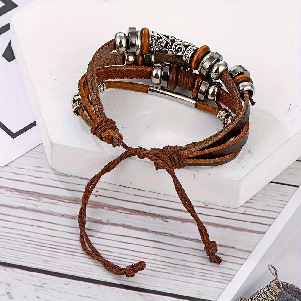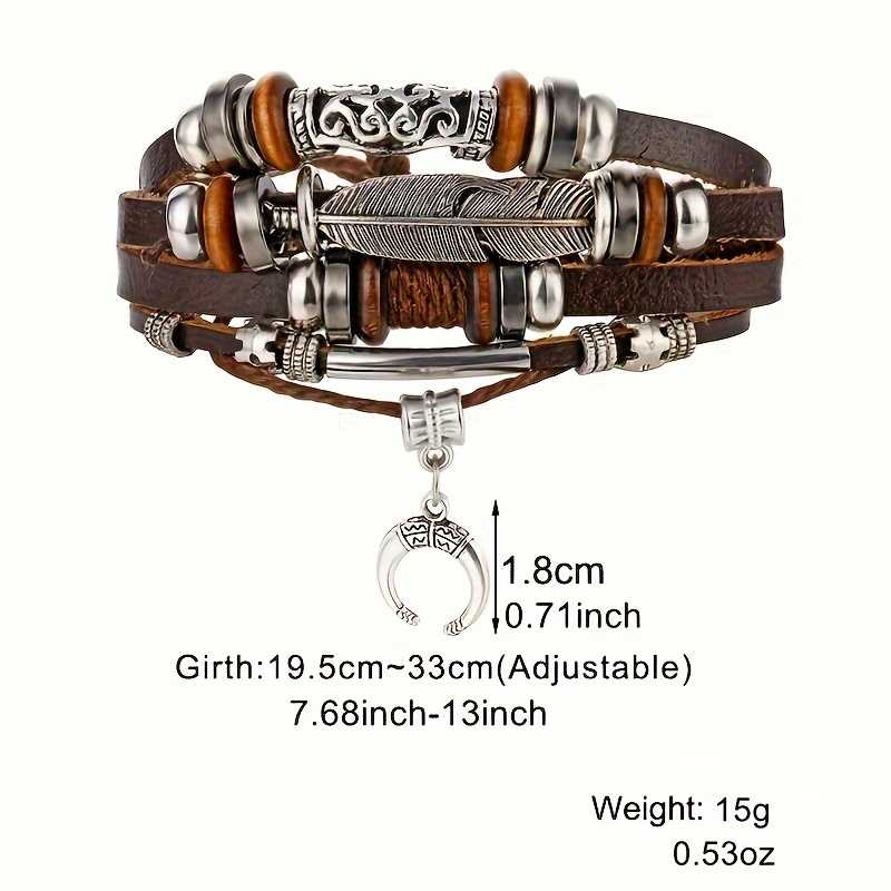 Men's Silver Multi Layer Braided Brown Leather Feather Moon Bead Bracelet