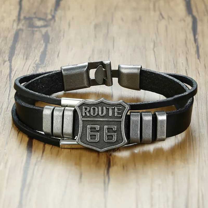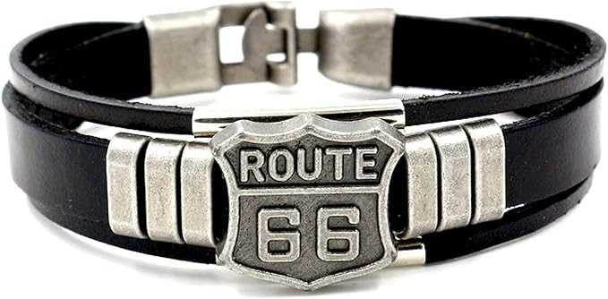 Men's Silver Plated Route 66 Buckle Leather Buckle Bracelet