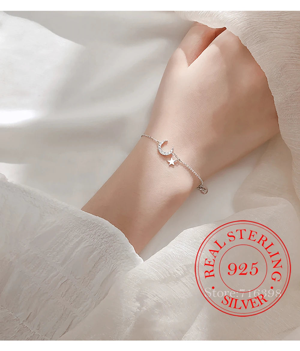 This stunning bracelet features a moon and star charm design with micro cubic zirconia stones. Made of high-quality 925 sterling silver, this bracelet is perfect for adding a touch of sparkle to any outfit.