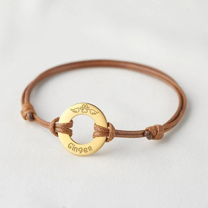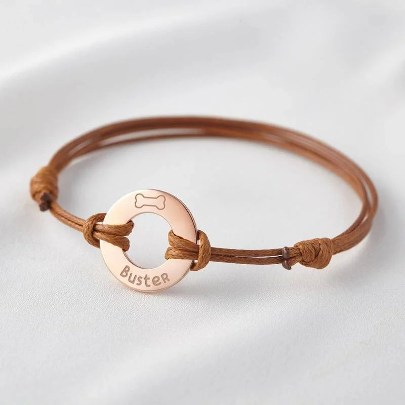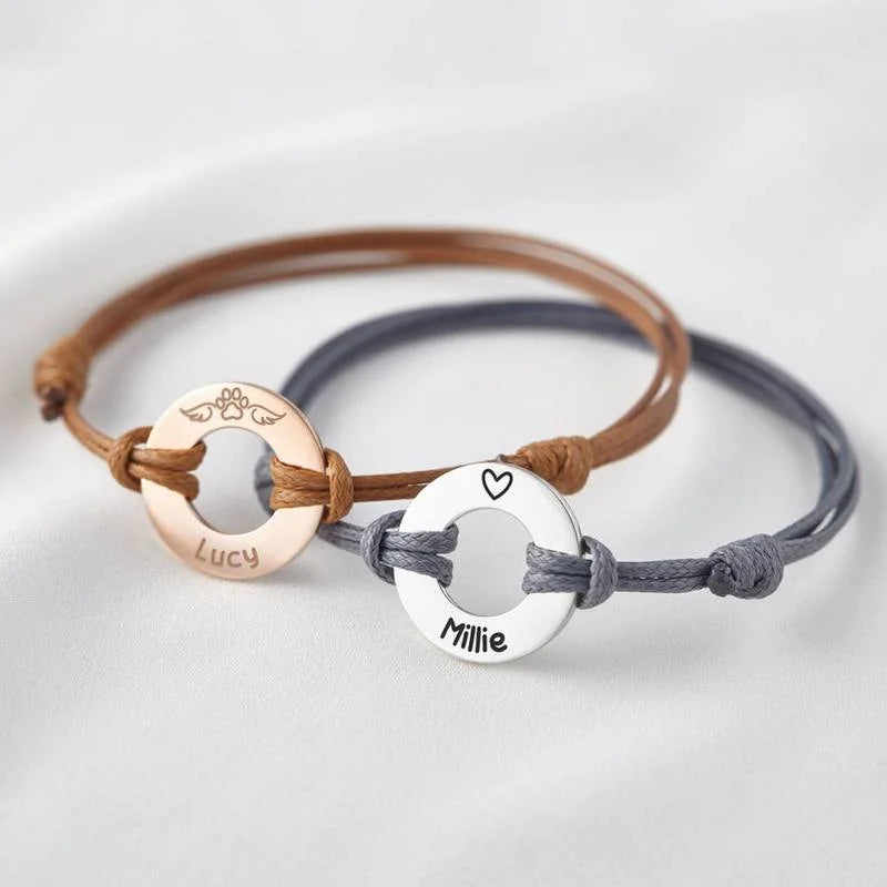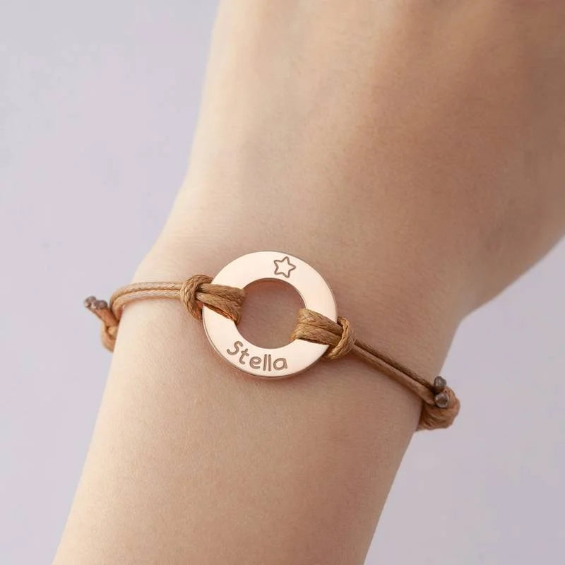 This adjustable leather string bracelet is a perfect accessory for women. Made of stainless steel with a round pendant that can be personalized with a name. Ideal for kids and adults.