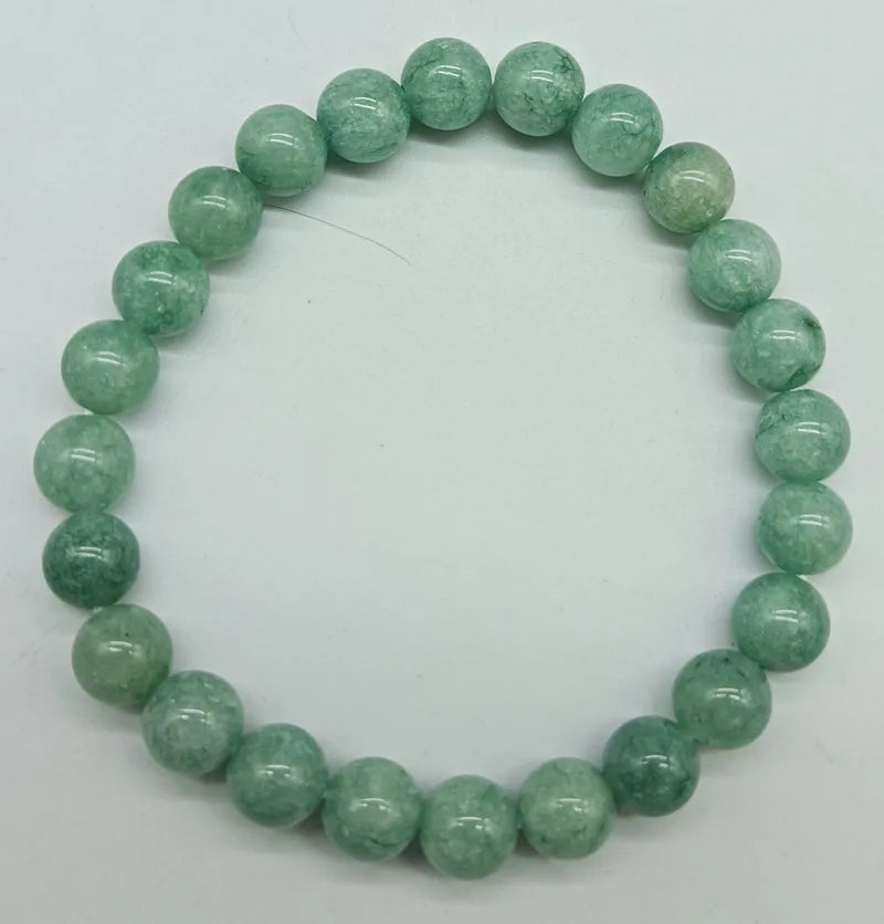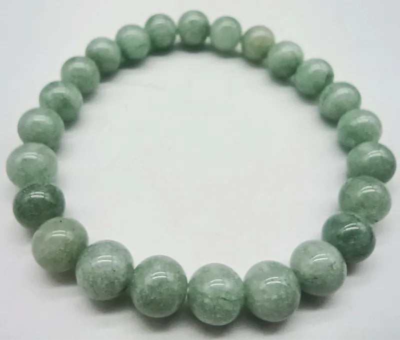 This elegant bracelet features delicate shallow green 8mm aquamarine round beads on an elastic band, perfect for women.