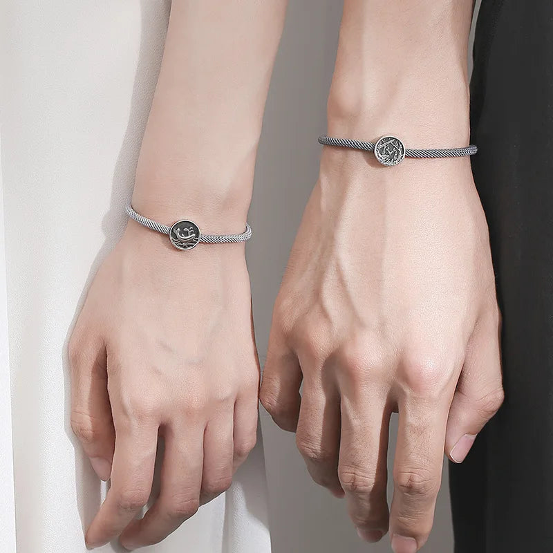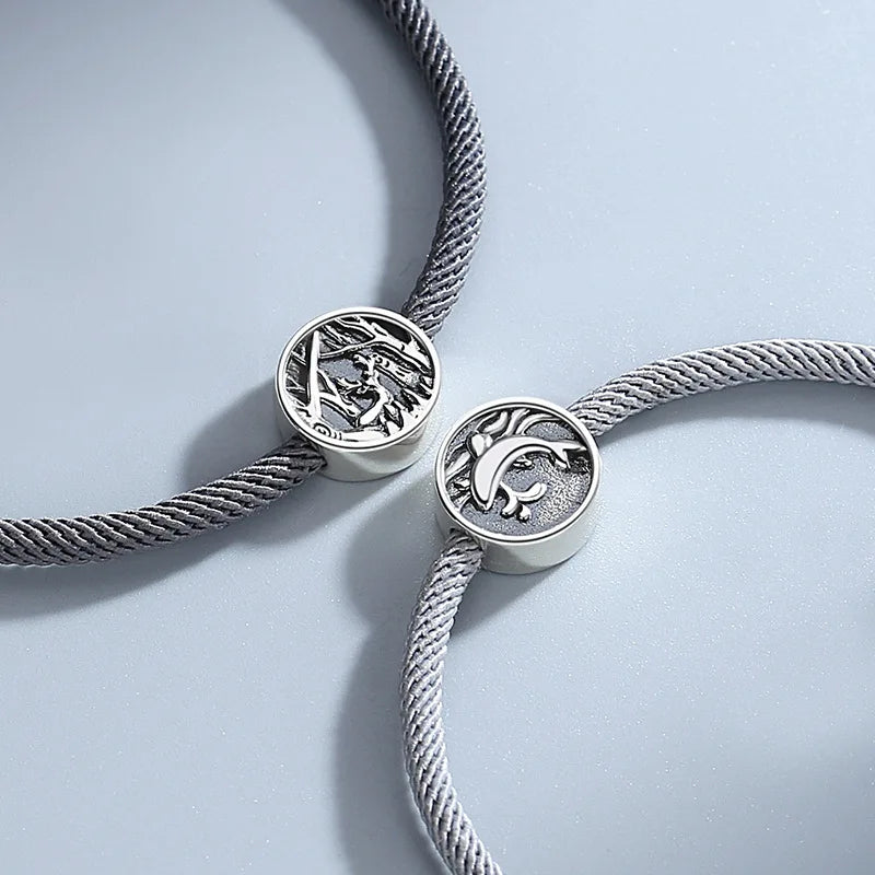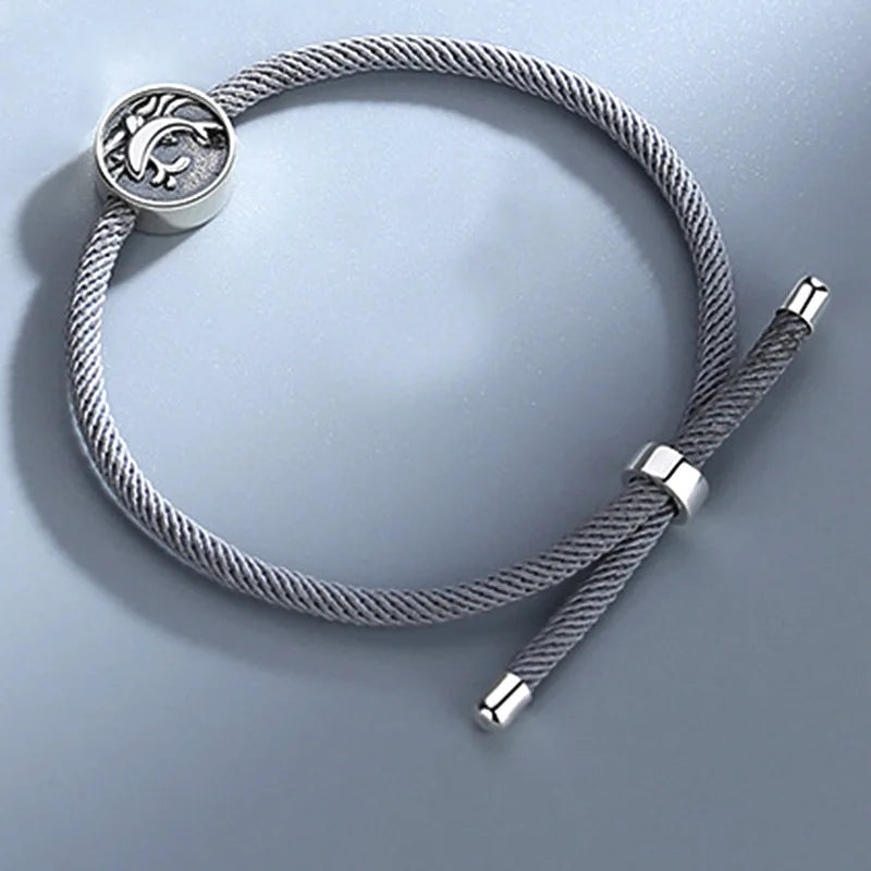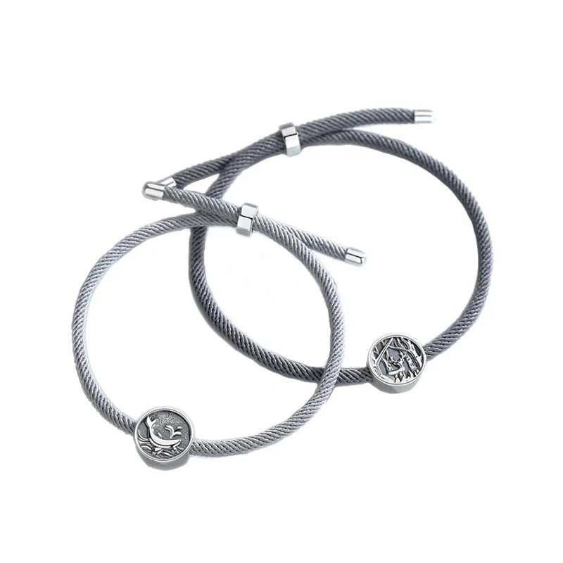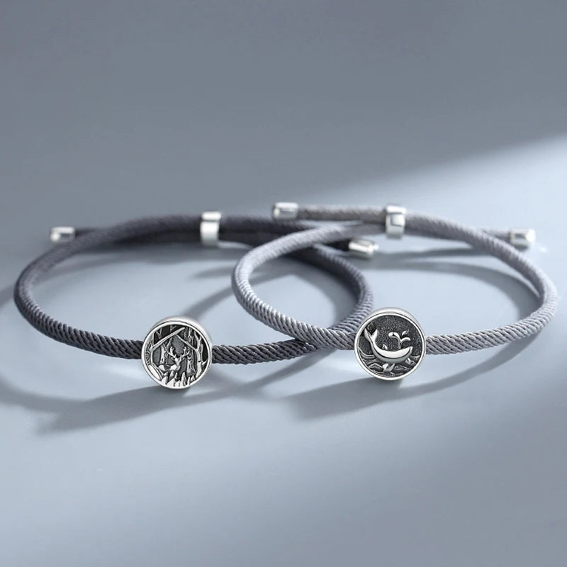 This personalized woven bracelet features a couple silver whale and elk pendants, perfect for celebrating long distance love on anniversaries or special occasions.