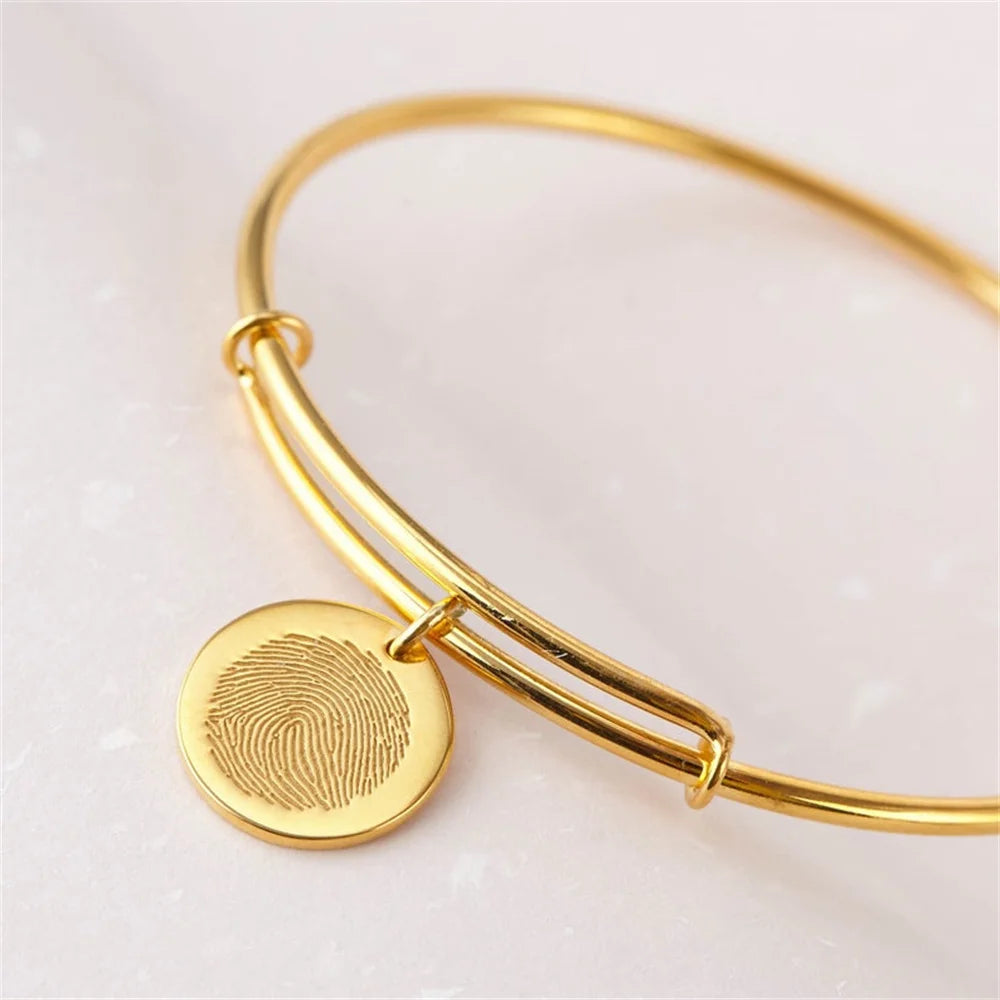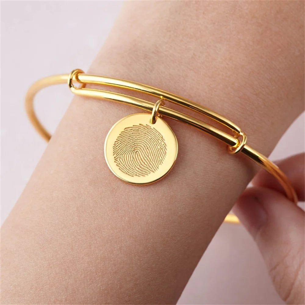 Personalized pulseras bangles for women, crafted in stainless steel. Ideal for couples, this bracelet features a thumbprint round pendant.