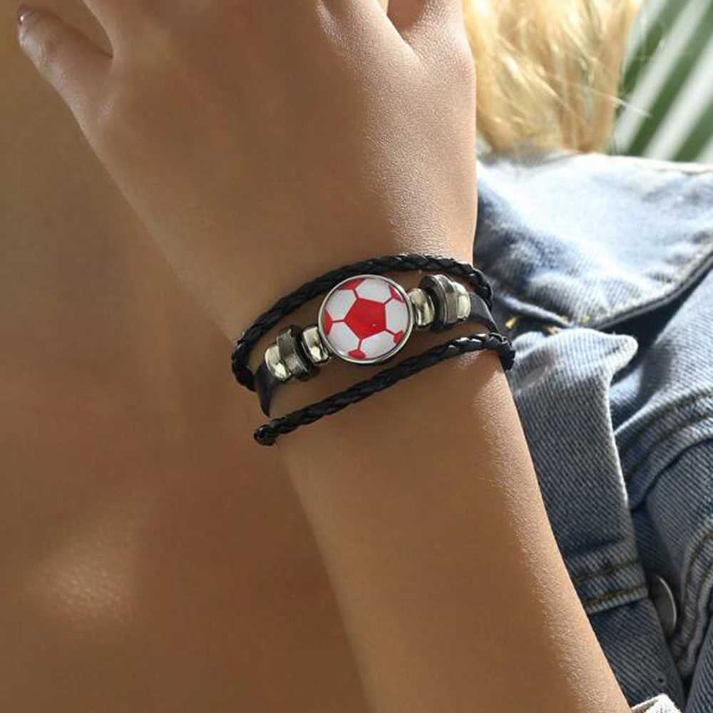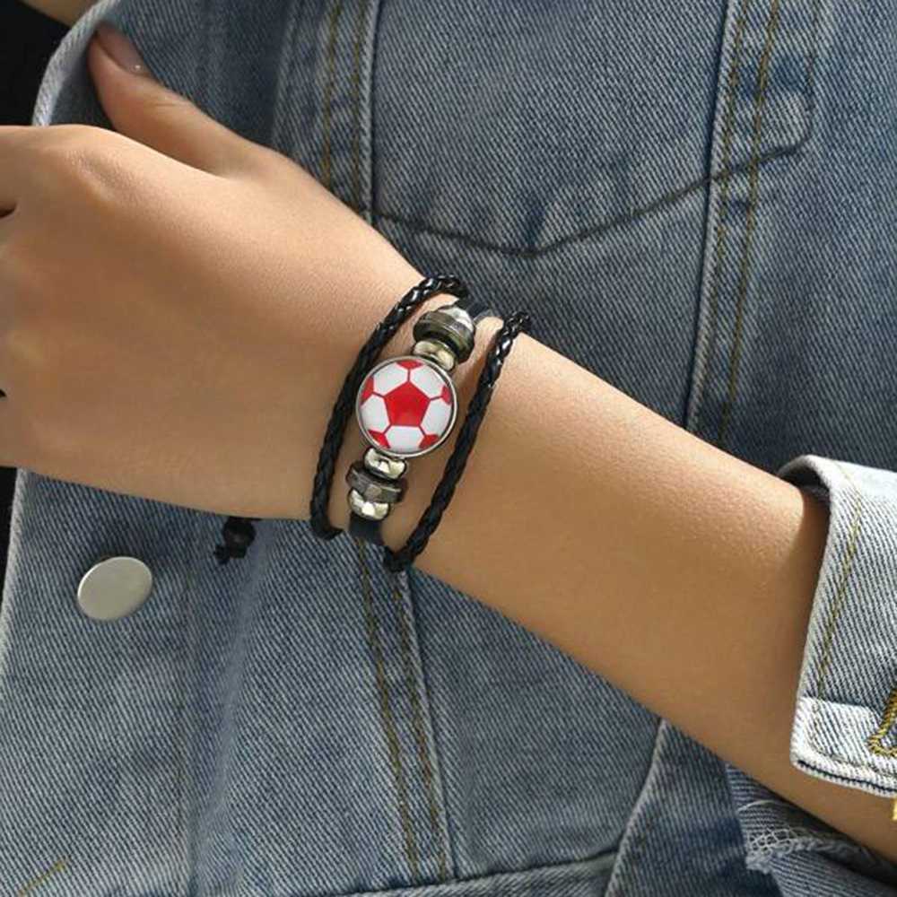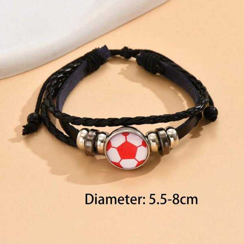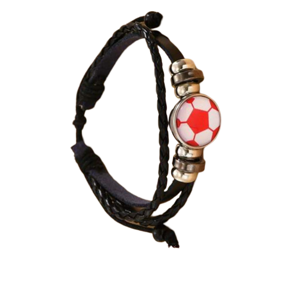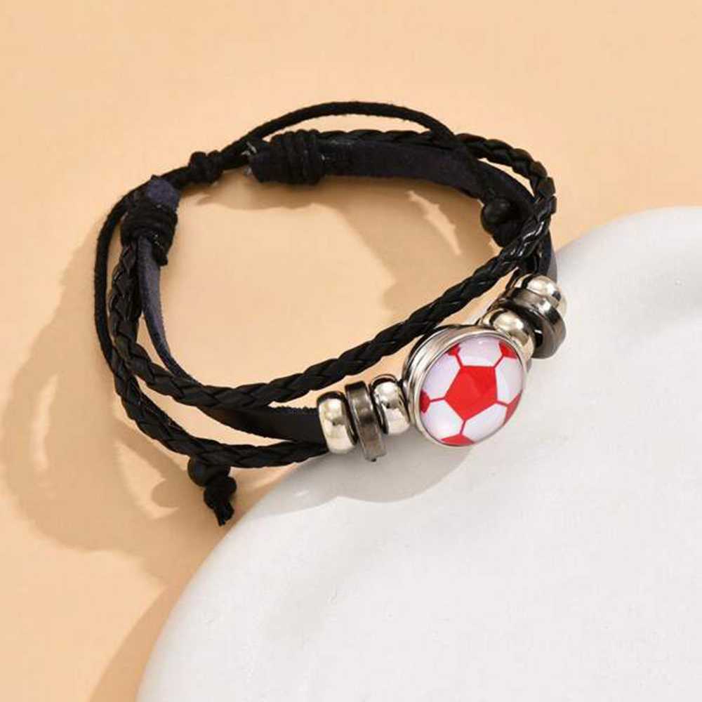 Unisex Black Leather & Red Football Beaded Rope Bracelet