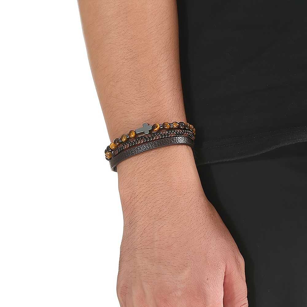 Bling Queen is an affordable fashion jewellery brand with various product types like bracelets, necklaces, earrings, rings, etc. suitable for women, men and kids. The Unisex Stainless Steel Multi Layer Yellow Brown Stone Beaded Cross Magnetic Leather Bracelet is a striking example of contemporary jewelry design that effortlessly combines style and symbolism. The bracelet features a multi layered design, with rich yellow and brown stone beads thoughtfully interspersed throughout. These stones add a natural element, each bead unique in color and texture, enhancing the bracelet's overall appeal. The cross motif, prominently displayed, serves as a powerful symbol of faith and individuality, making it a meaningful accessory for both men and women. The leather's rich texture contrasts beautifully with the sleek, polished stainless steel elements, creating a sophisticated look that complements a variety of outfits. The bracelet is secured with a convenient magnetic closure, ensuring ease of wear while providing a reliable fit.