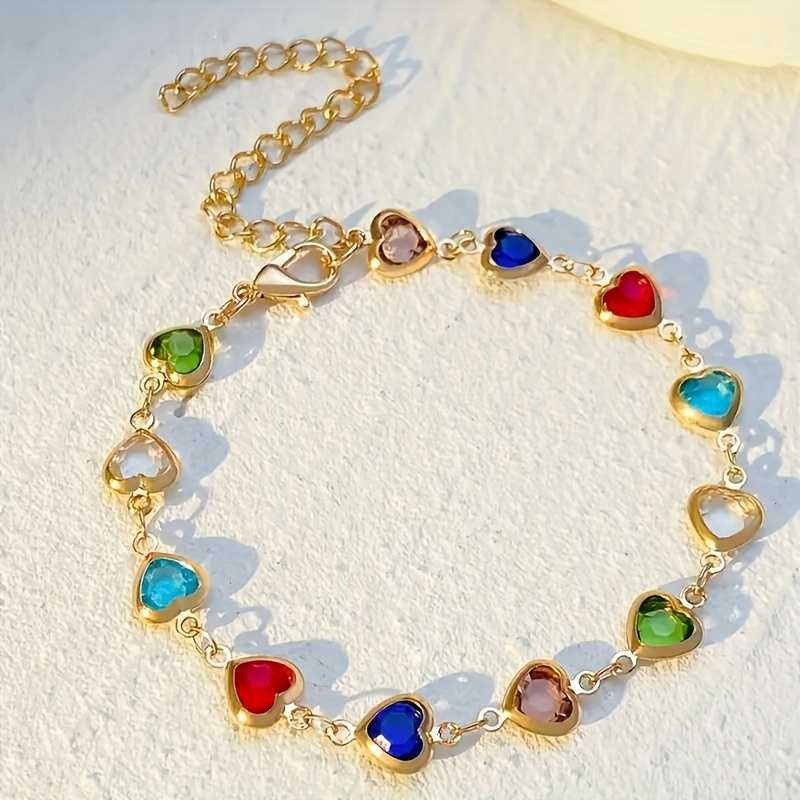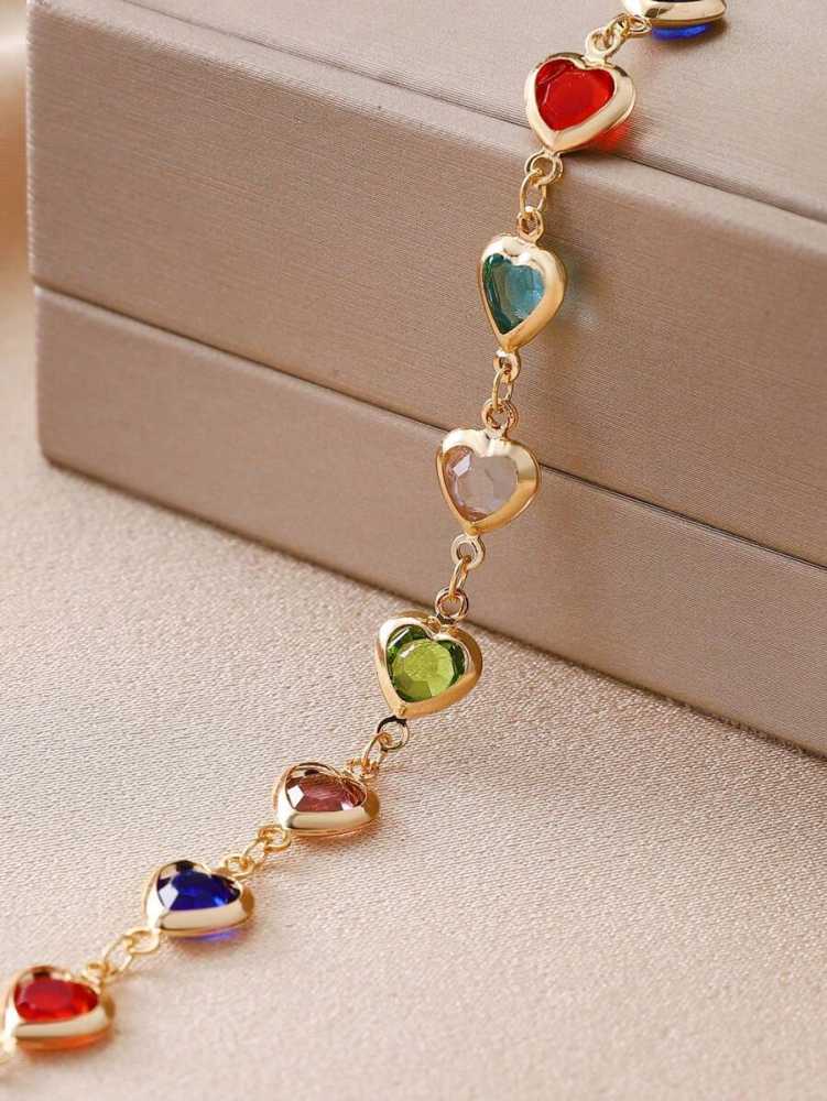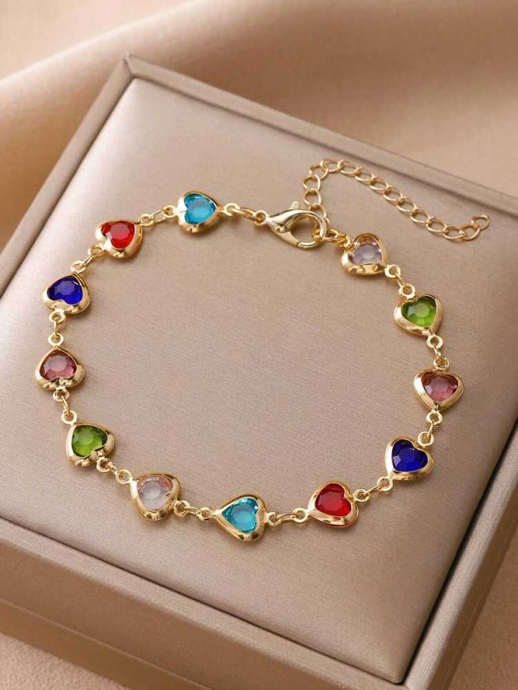 - Product Particulars: Crafted from high quality gold plated copper metal and embellished with tiny heart cut colourful zirconia stones. The bracelet comes with lobster claw closure with an adjustable mechanism, which is of length 22.5cm.