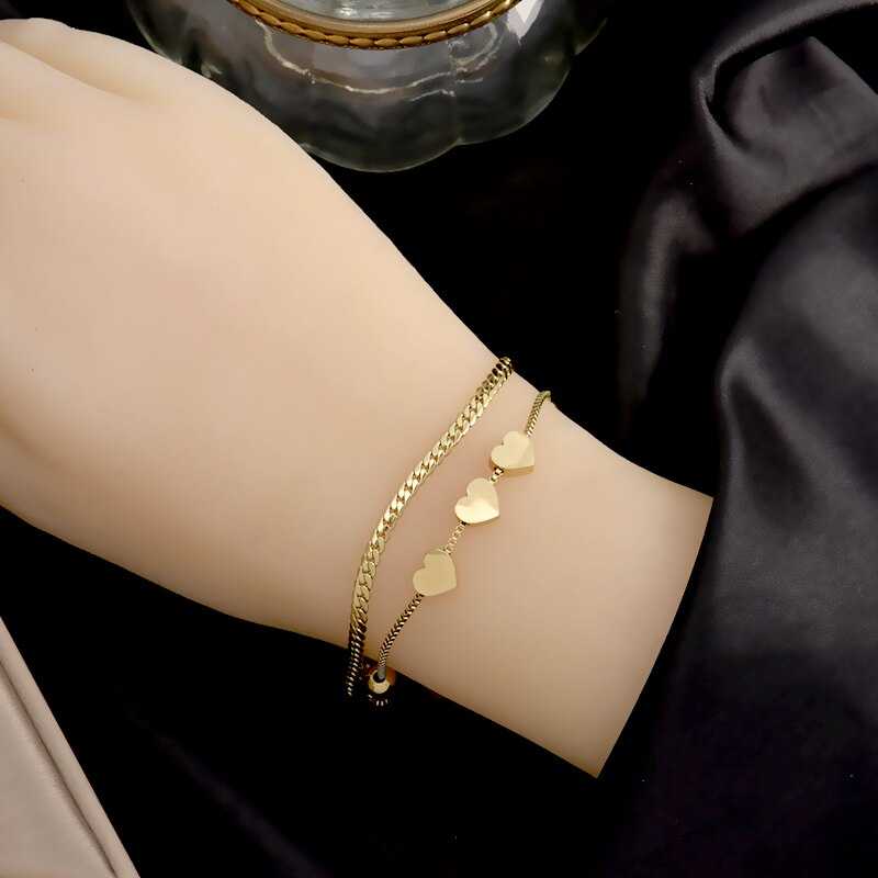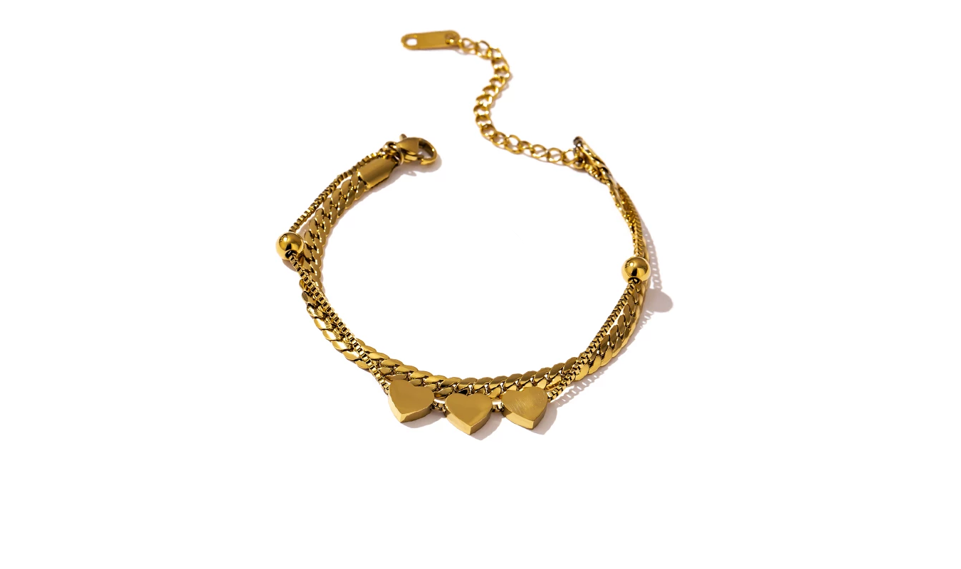 Bling Queen is an affordable fashion jewellery brand with various product types like bracelets, necklaces, earrings, rings, etc. suitable for women, men and kids. The bracelet consists of two layers of chains, each with its own unique design and length. The layers are typically arranged in a staggered or overlapping fashion, creating a dynamic and visually appealing look. The double layer design adds depth and dimension to the bracelet, enhancing its overall elegance. This double layer bracelet brings together two separate, elegant chains with a lobster clasp. One chain features a three solid heart and beads linked on a stunning box chain while the other is a curb chain.