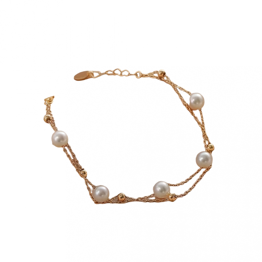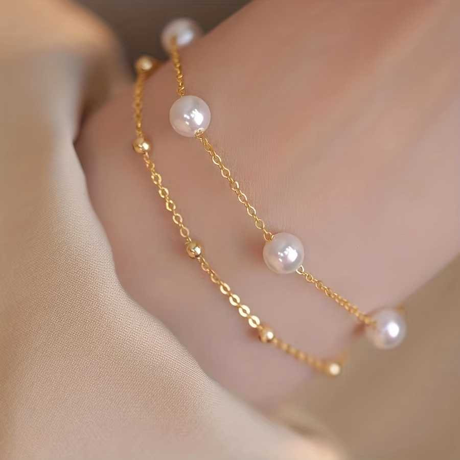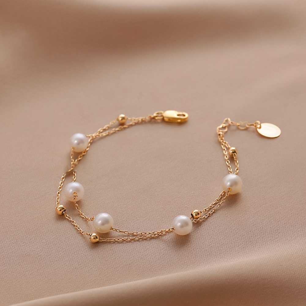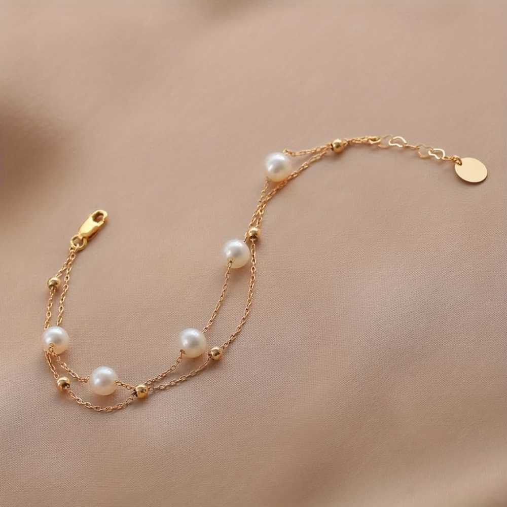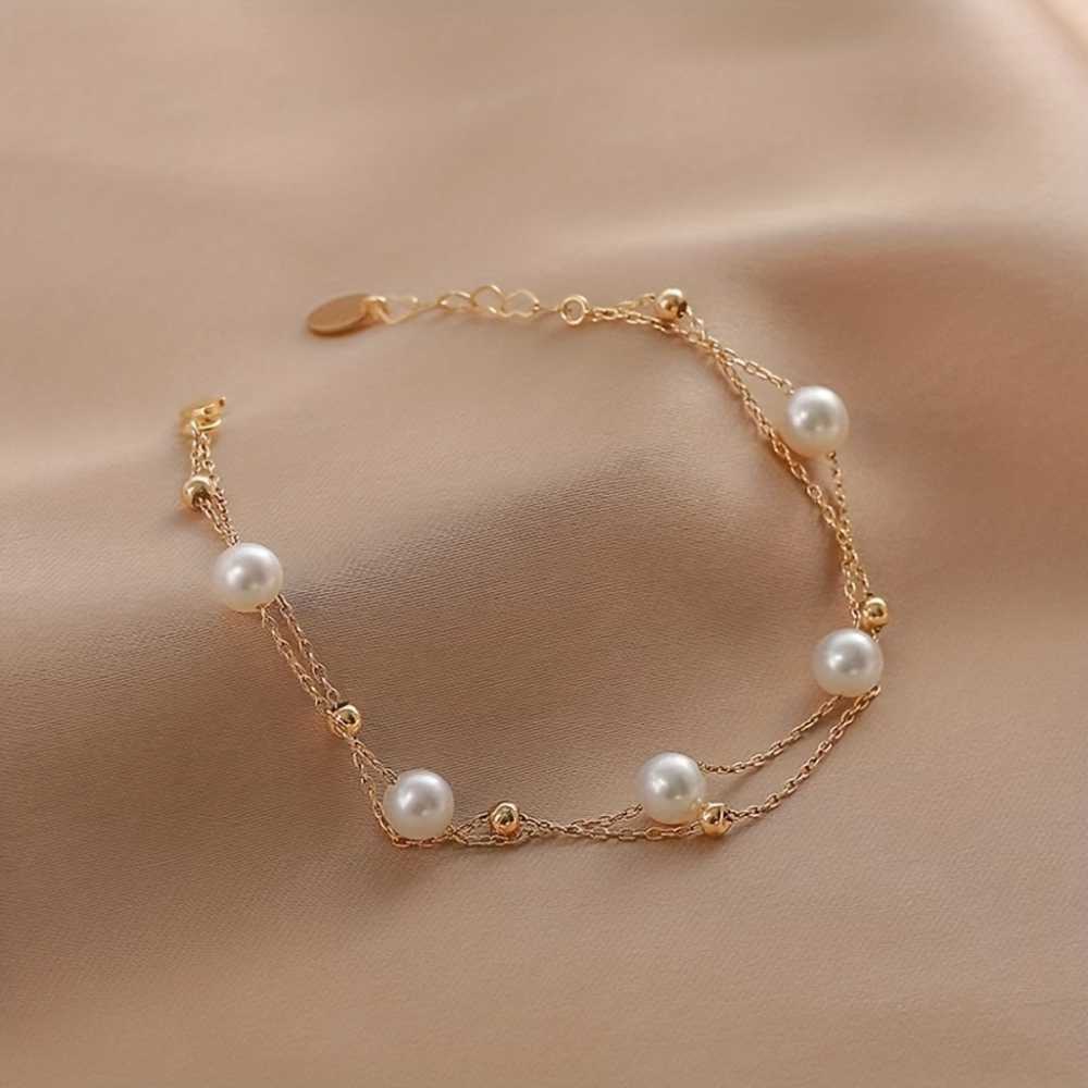 The women’s gold plated double layer white pearl beaded chain bracelet embodies elegance and sophistication. This exquisite piece features two layers of lustrous white pearls, each hand selected for its brilliant sheen and flawless surface, creating a luxurious look that effortlessly elevates any outfit. The double layer design adds depth and dimension, ensuring that this bracelet stands out as a statement piece. Crafted with high quality gold plating, the bracelet offers a warm glow that beautifully complements the pearls. The delicate gold plated chain intersperses the pearls, creating a harmonious balance between classic charm and modern flair. Each pearl is meticulously strung to allow for graceful movement, enhancing its overall fluidity and elegance. Ideal for both casual and formal occasions, this bracelet is a versatile accessory that adds a touch of sophistication to any ensemble.