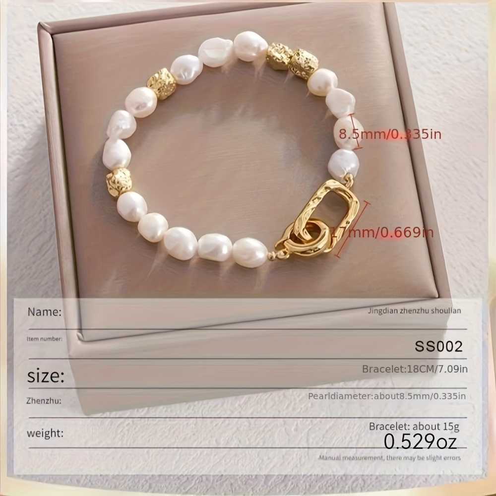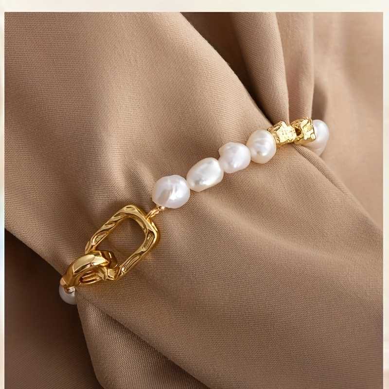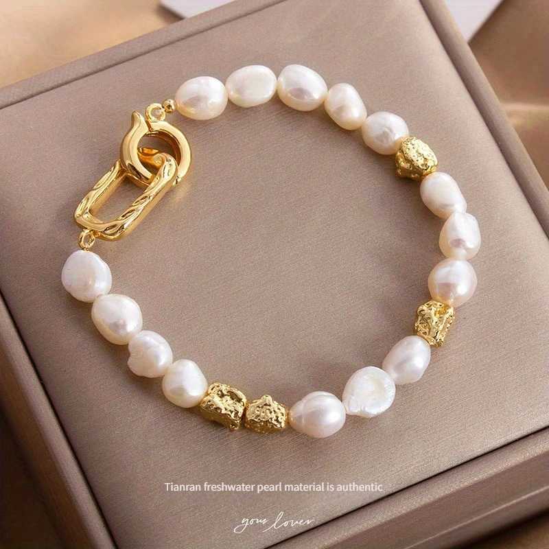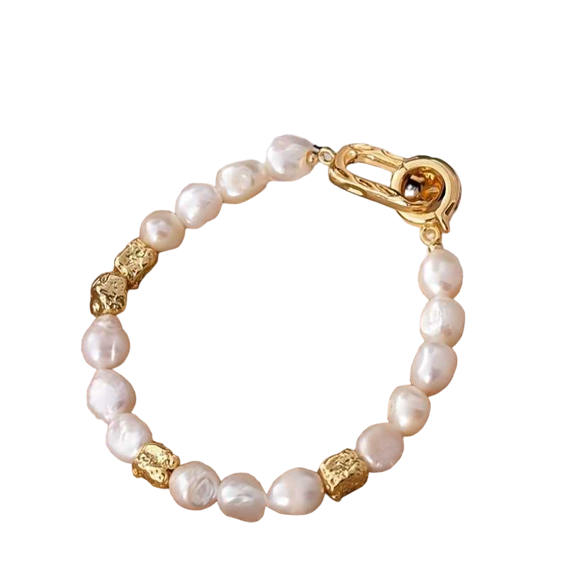 Women's Gold Plated White Pearl And Gold Nugget Beaded Chain Bracelet