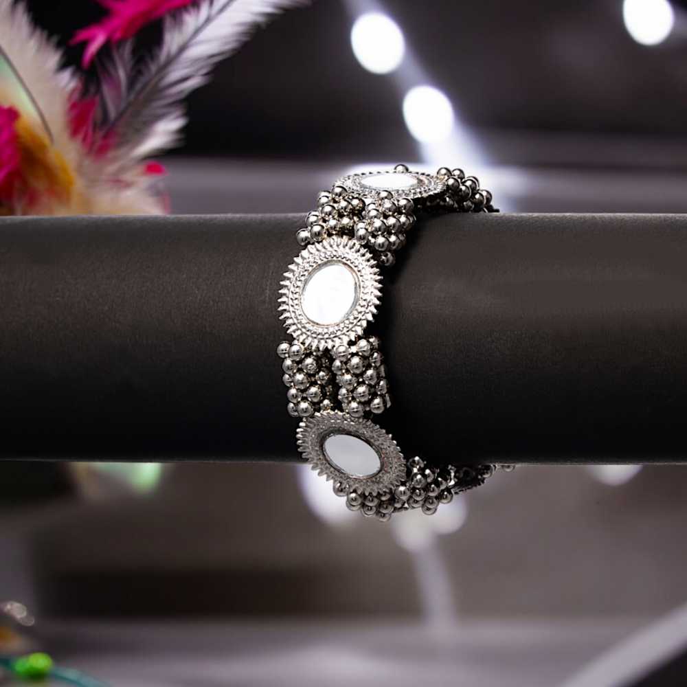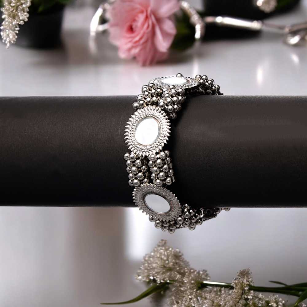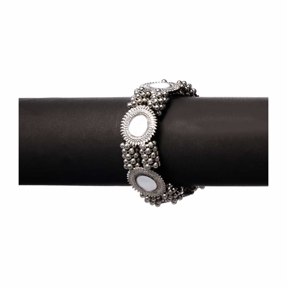 Women's Oxidized Silver Beaded Bracelet With Mirror Work