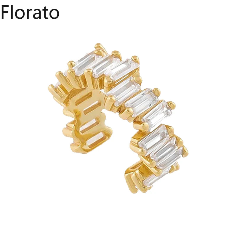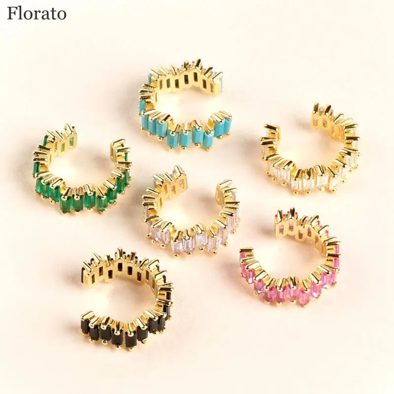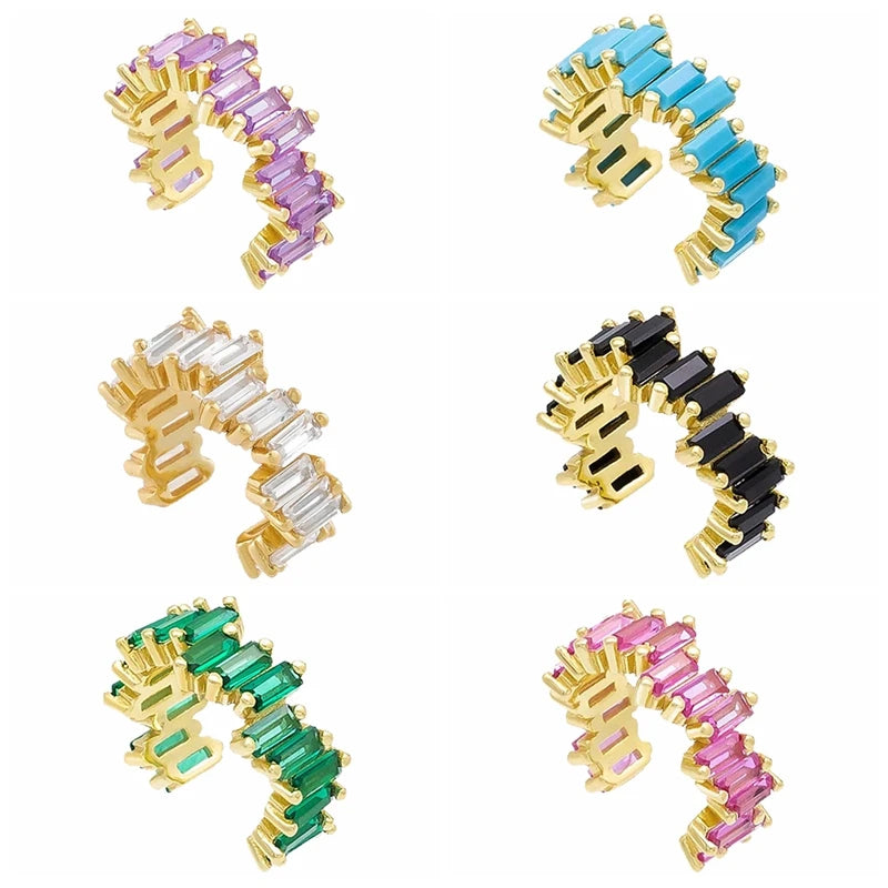 Enhance your style with these stunning 24K plated ear cuff earrings featuring a colorful C shape design with cube zircon stones. Perfect for non-pierced ears.
