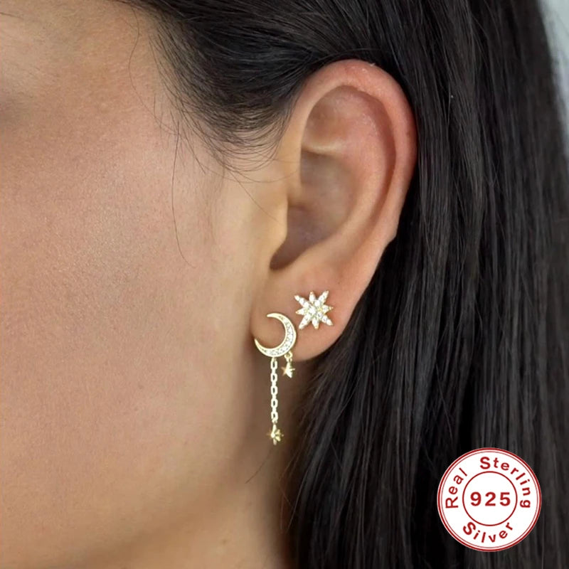 Adorn your look with these stunning asymmetrical star and moon earrings made of 925 sterling silver. The crystal charms add a touch of elegance, perfect for women and girls.