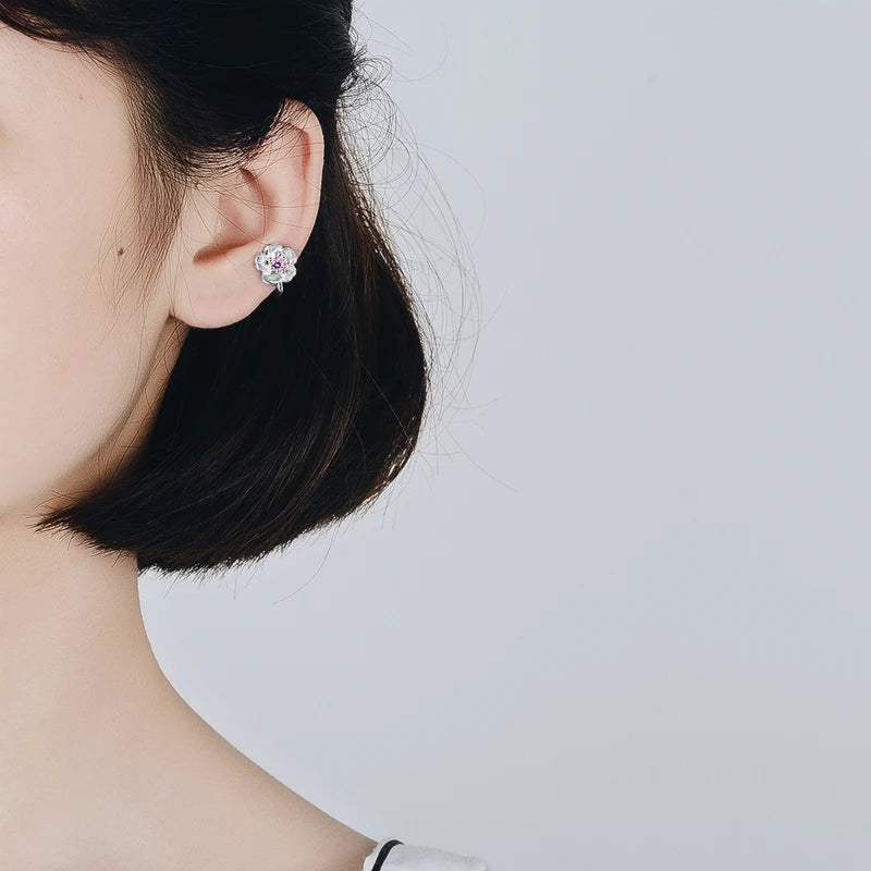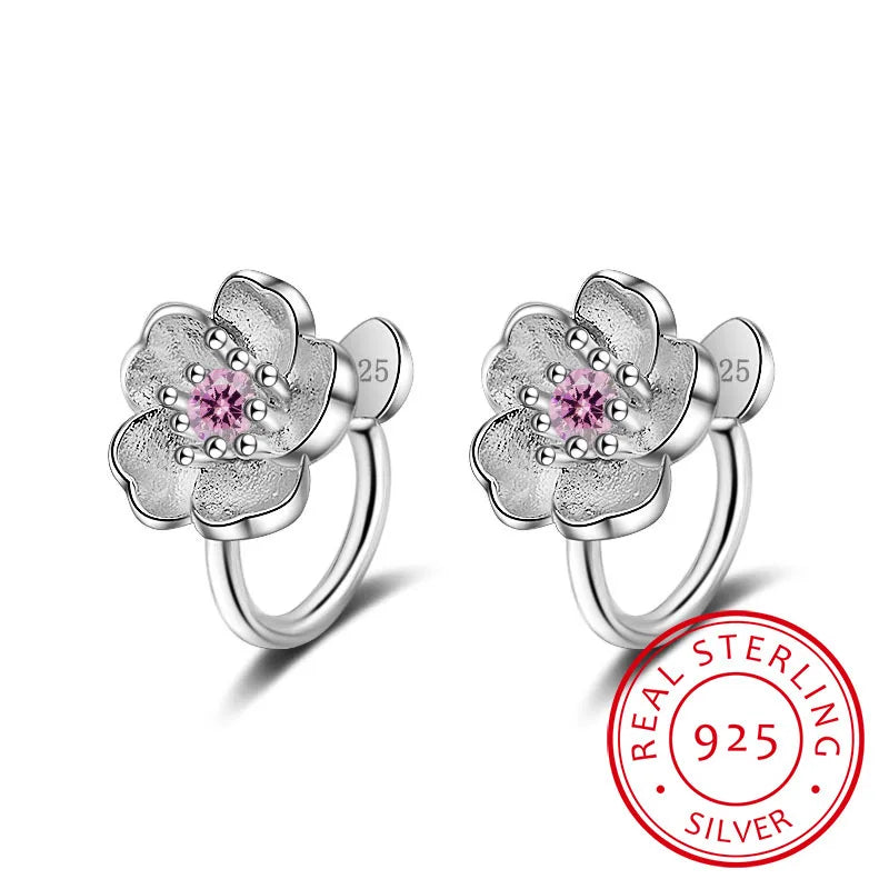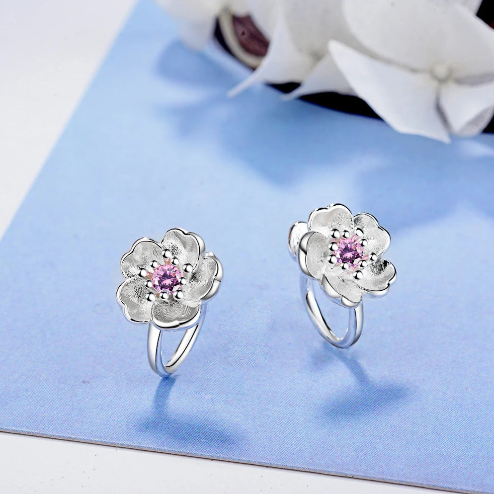 Beautiful cherry blossoms flower hoop earring set made with 925 sterling silver featuring pink CZ stones. Perfect for women, girls, and kids.