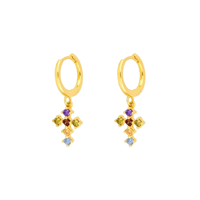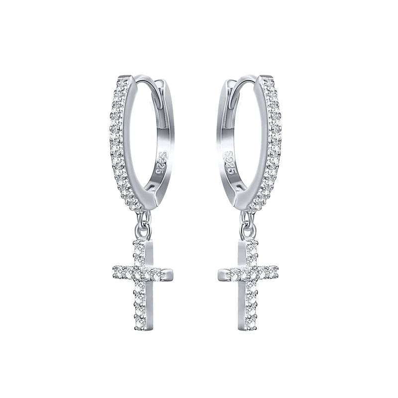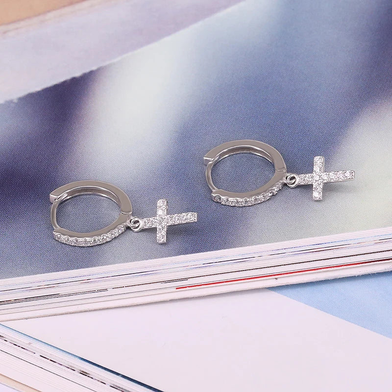 925 Silver Cross Stud Earrings Zircon Huggie Round Hoops