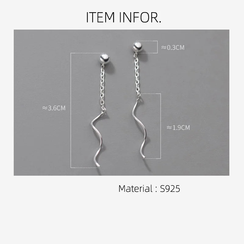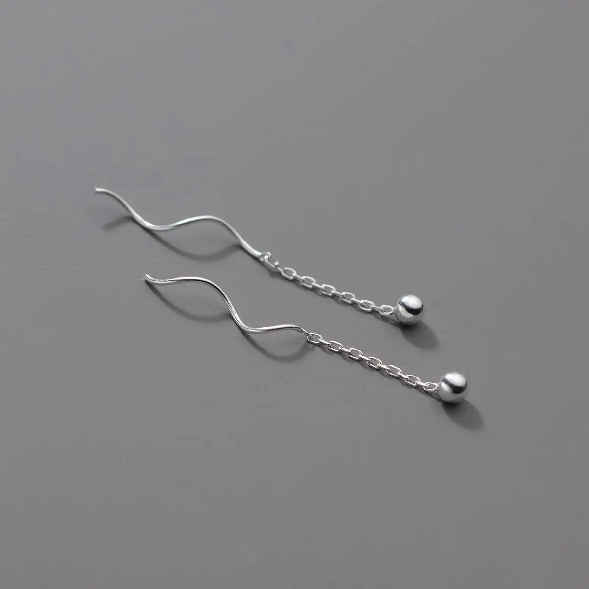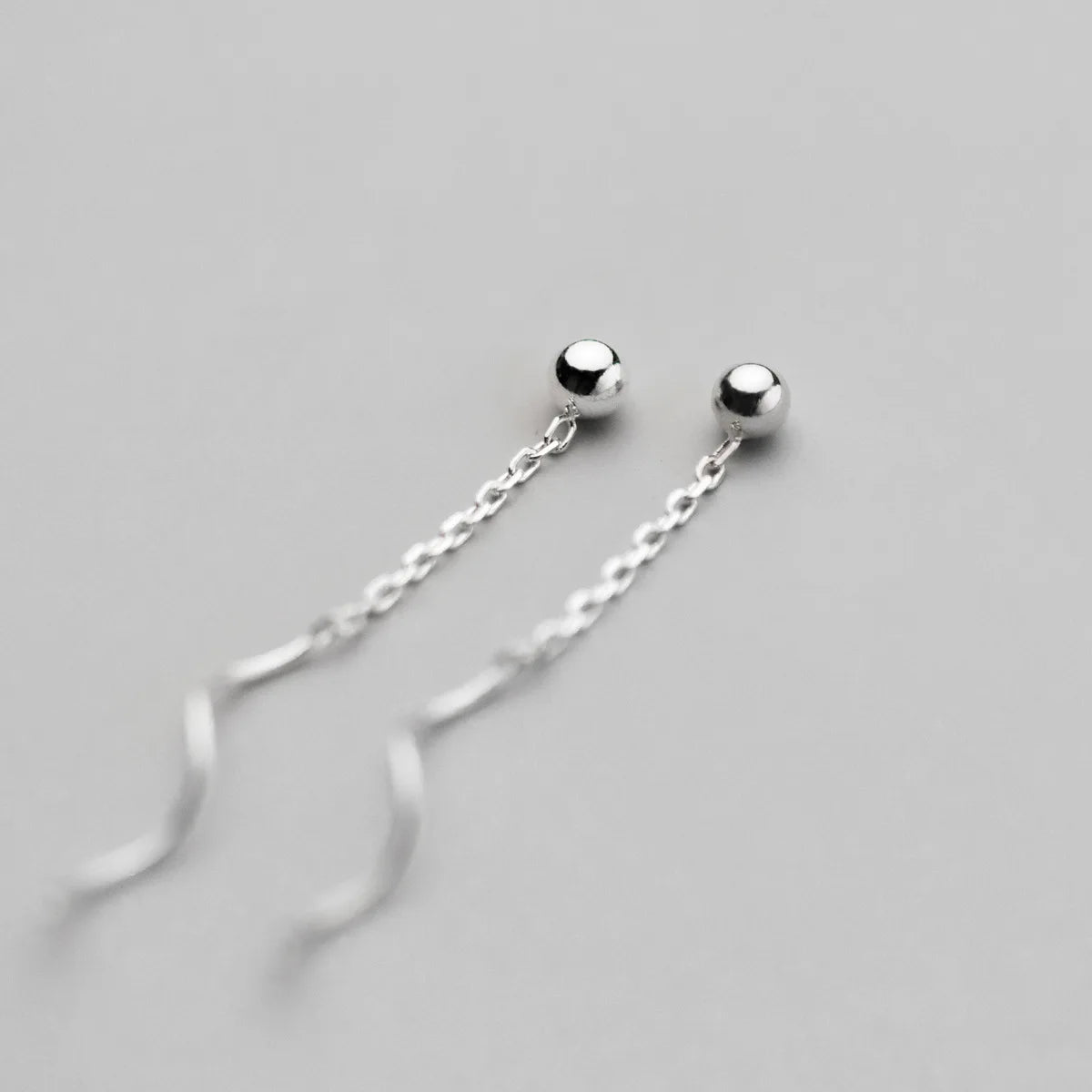 Elegant and stylish 925 sterling silver earrings for women. These stud earrings feature a ball and wave design with a drop chain for added sophistication.