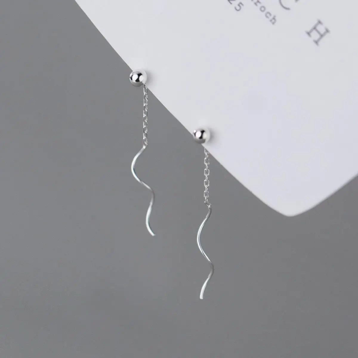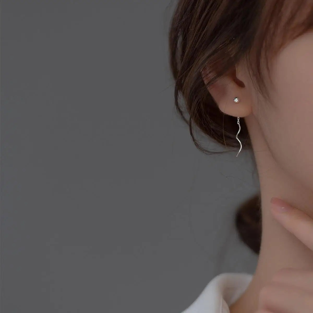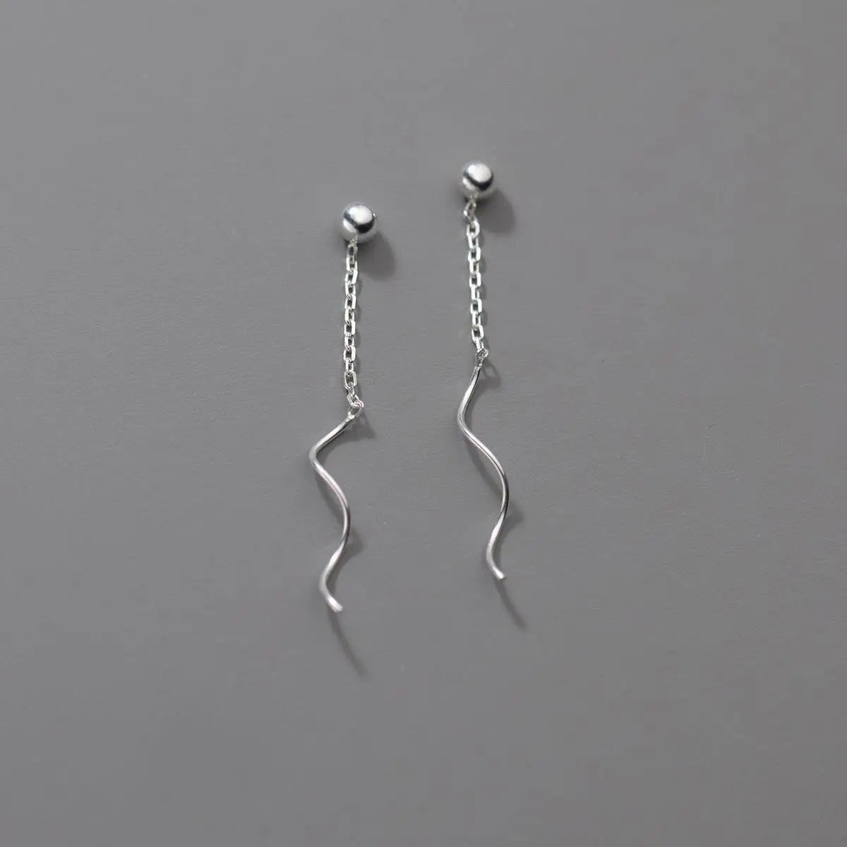 Elegant and stylish 925 sterling silver earrings for women. These stud earrings feature a ball and wave design with a drop chain for added sophistication.