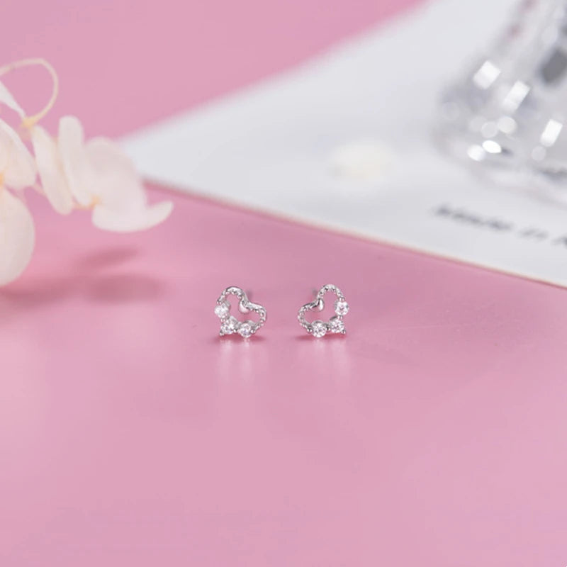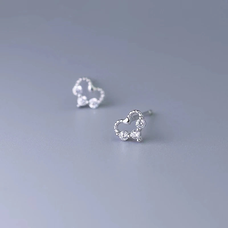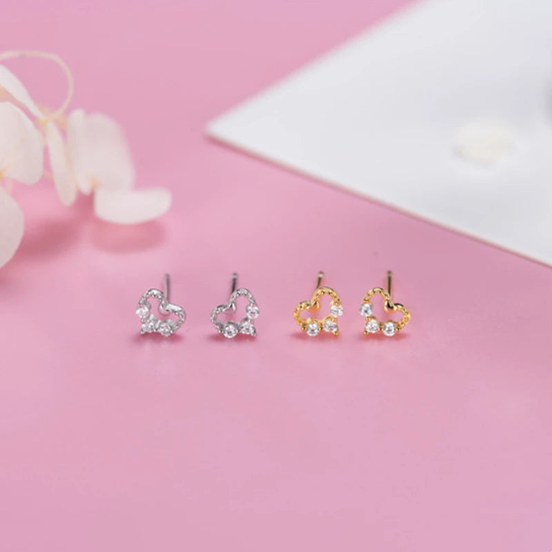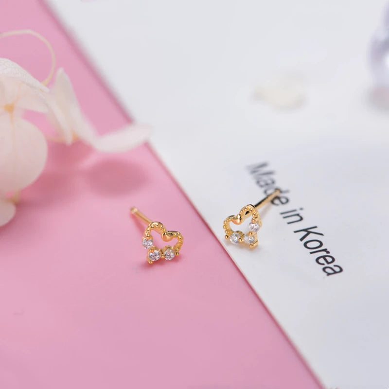 Adorn your ears with these elegant mini heart stud earrings featuring three sparkling zircon stones. Perfect for weddings and special occasions.