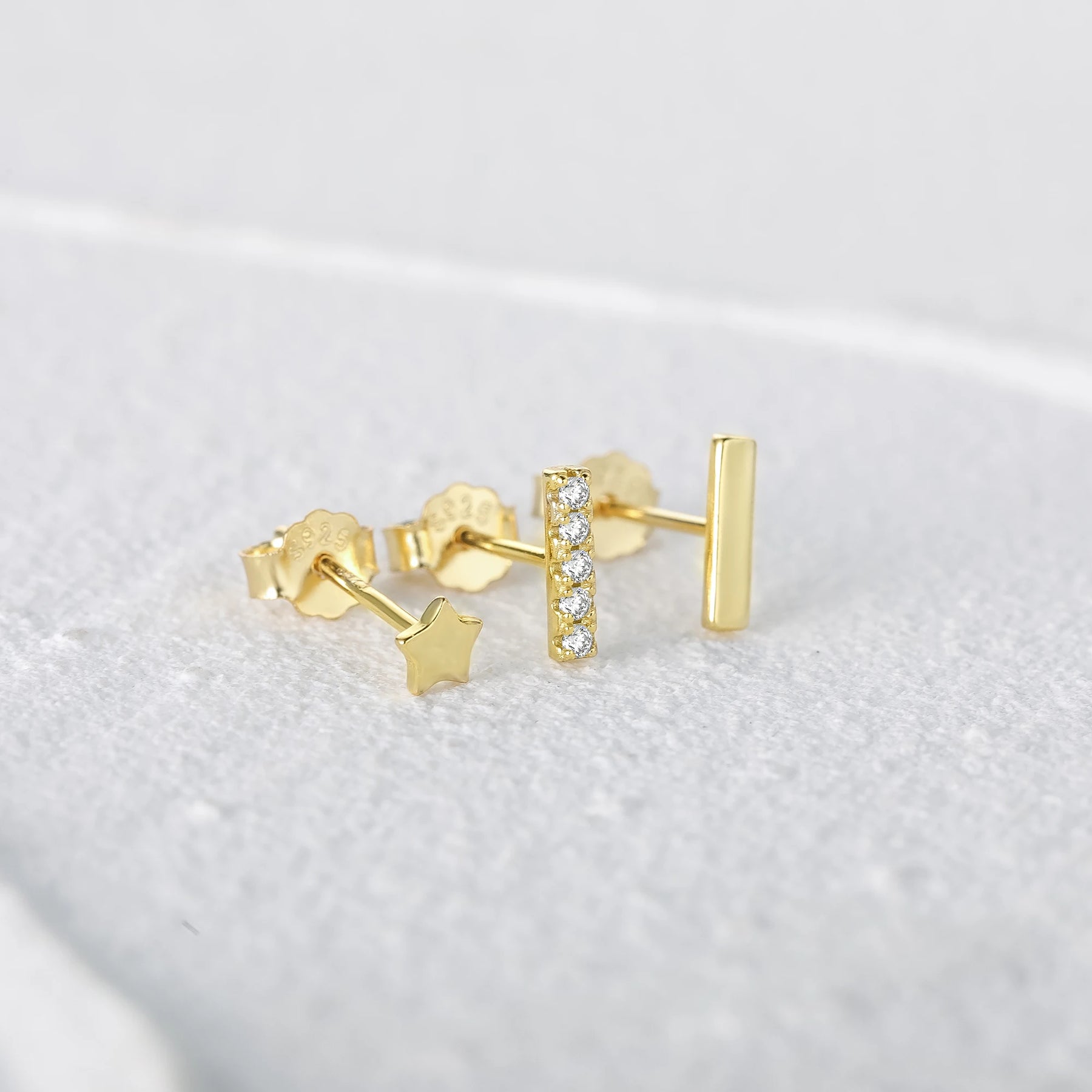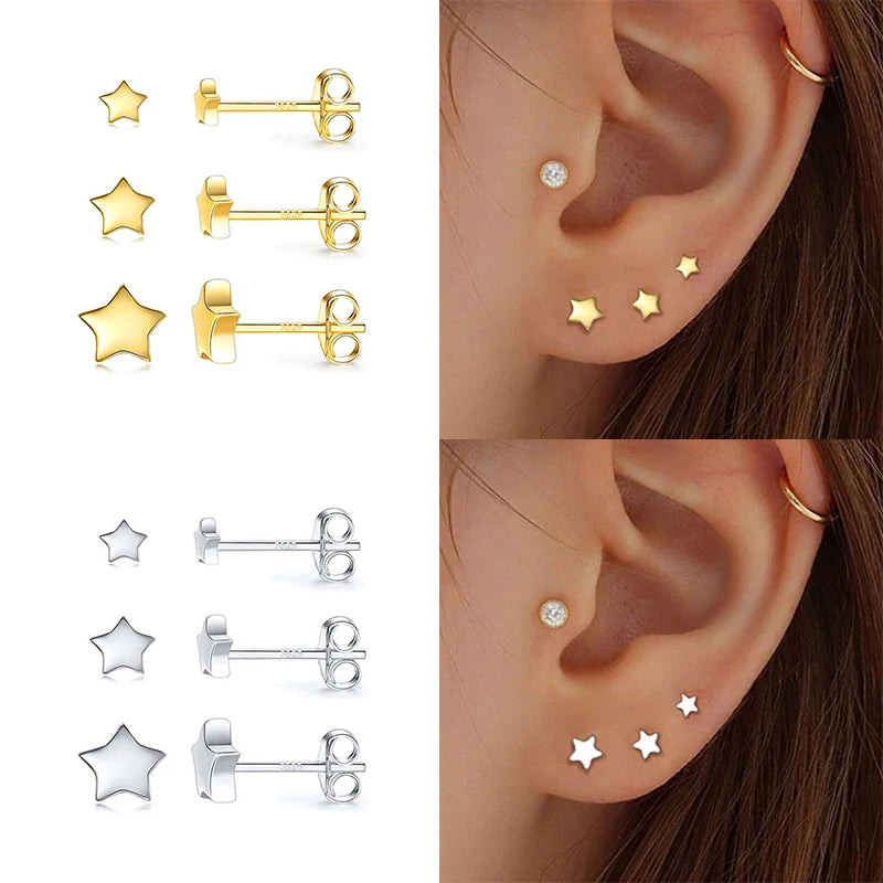Add a touch of sparkle to your look with these 925 silver stud earrings featuring mini star, crystal bar, triangle, and round designs. Perfect for everyday wear or special occasions.