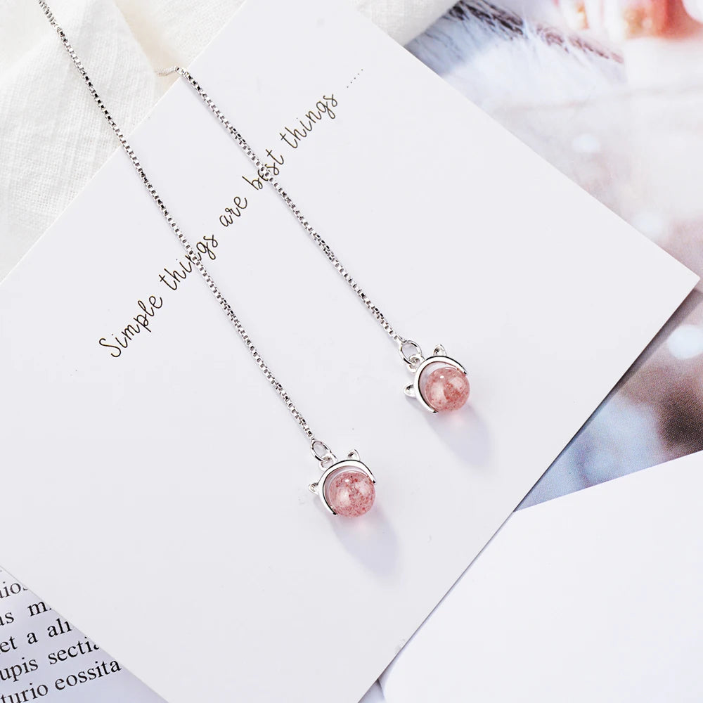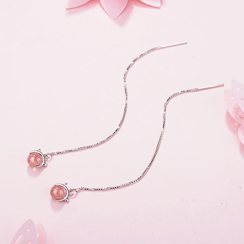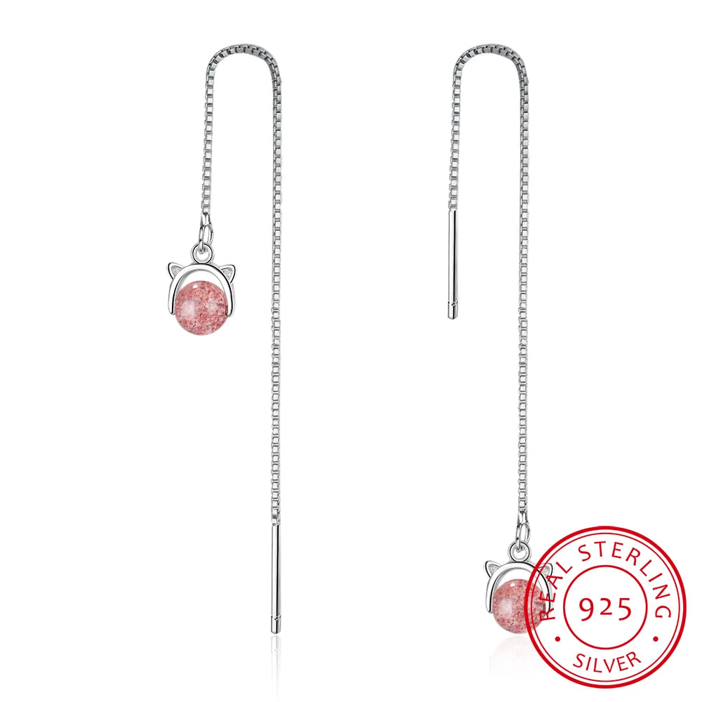 Gorgeous 925 sterling silver earrings featuring pink strawberry crystal cat design with long tassel drops, perfect for daughters and girls.