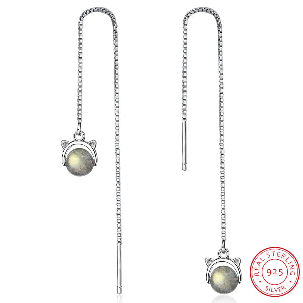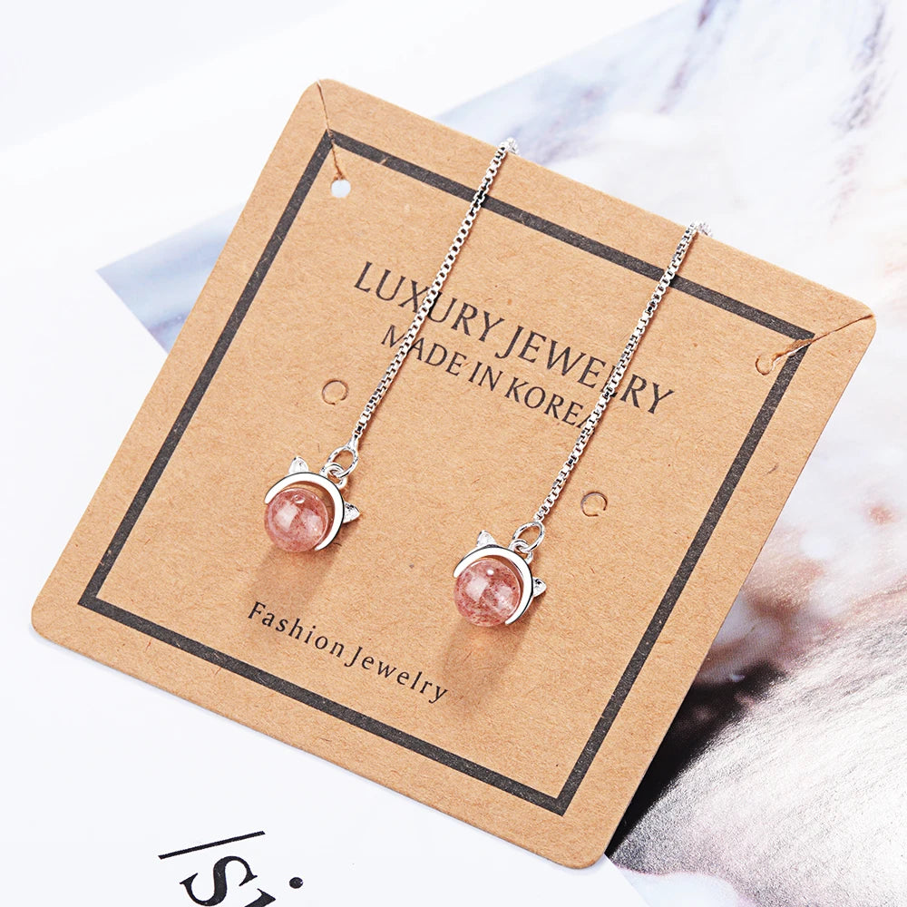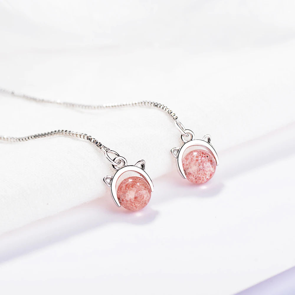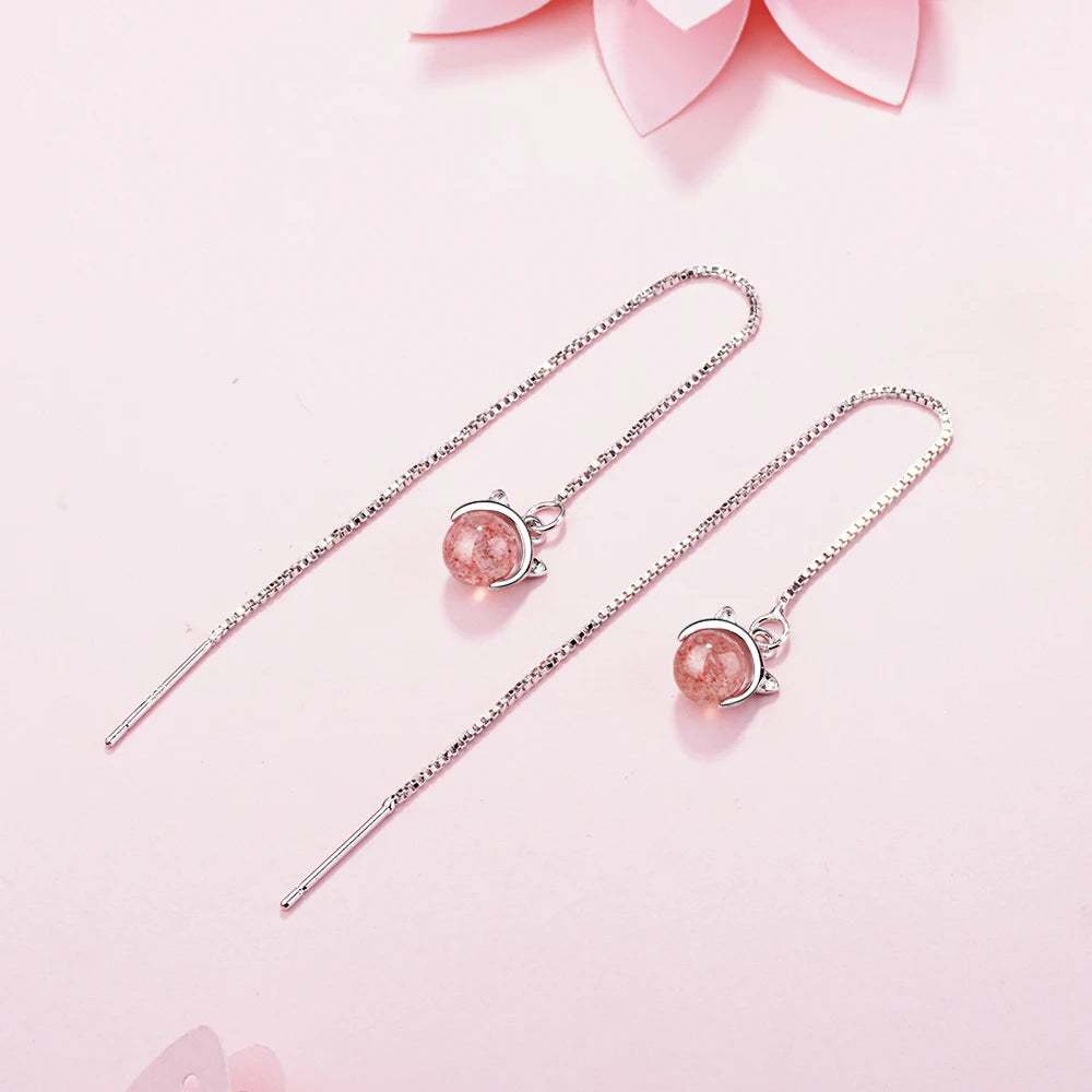 Gorgeous 925 sterling silver earrings featuring pink strawberry crystal cat design with long tassel drops, perfect for daughters and girls.