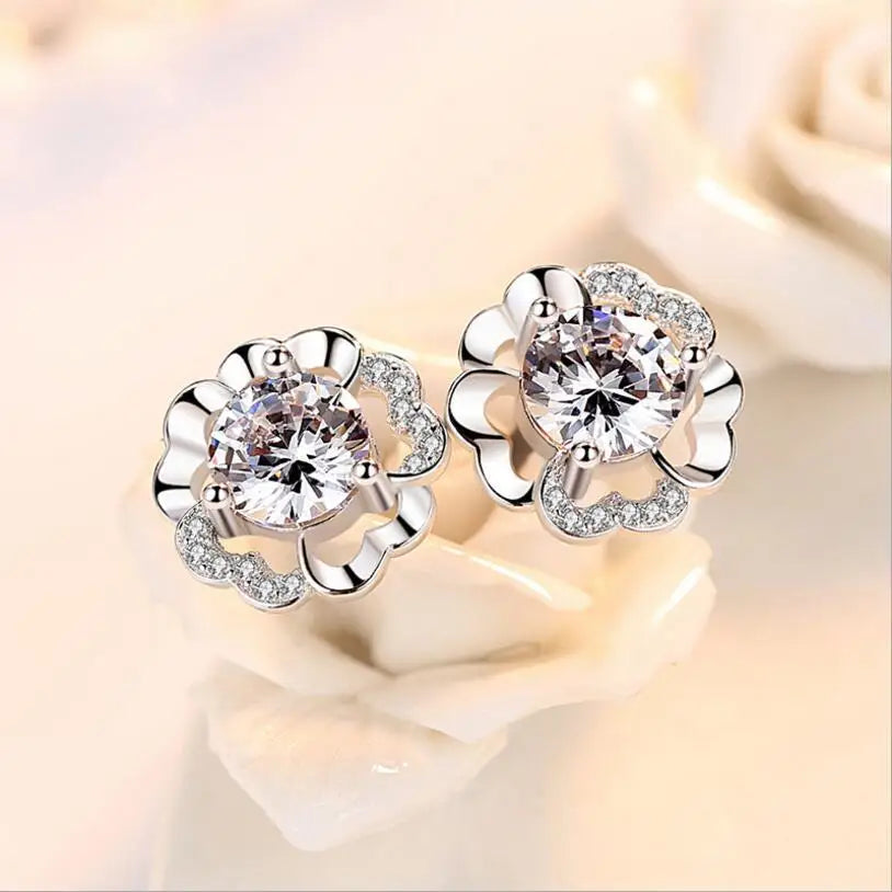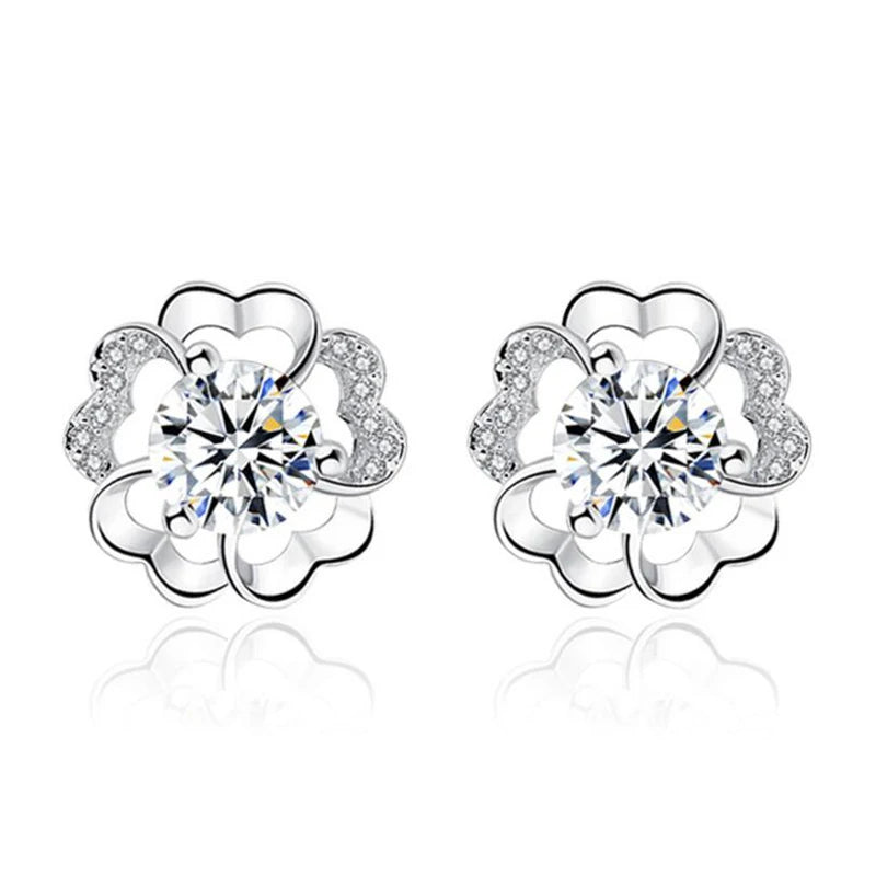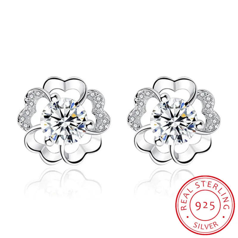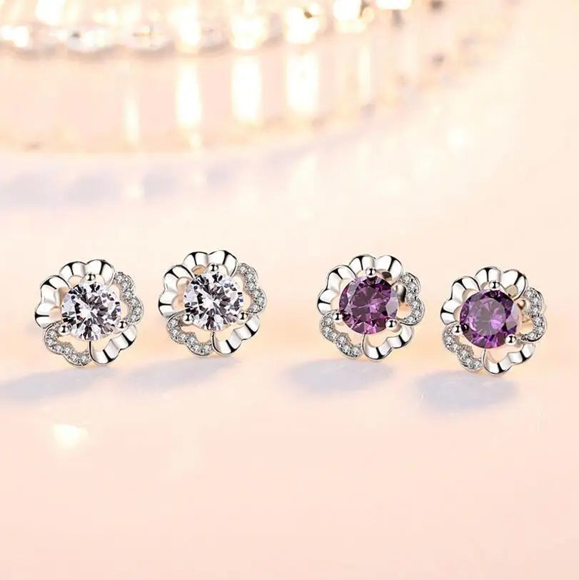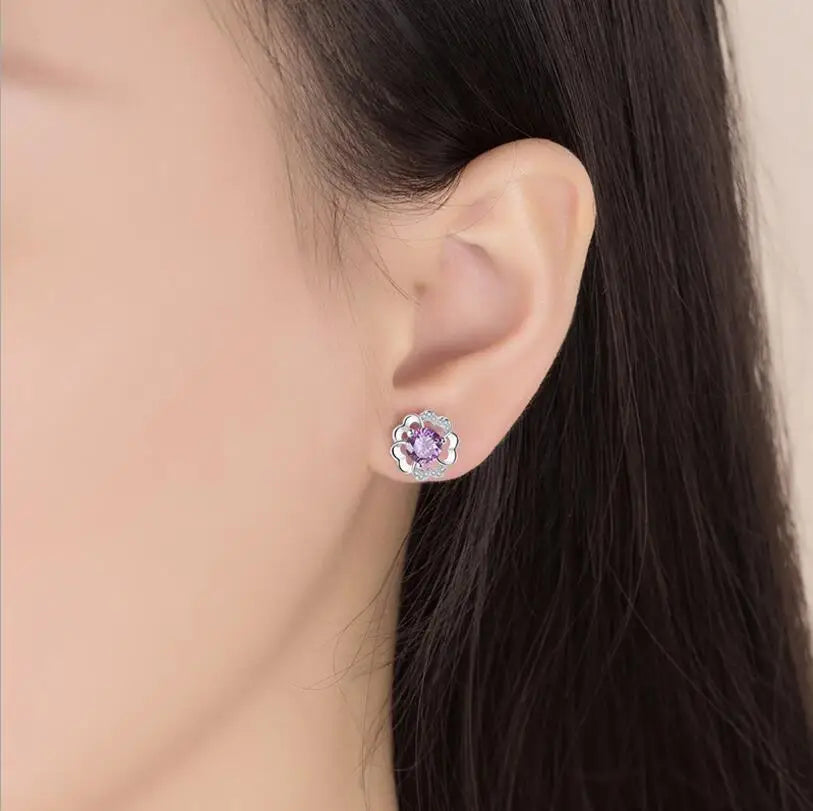 925 Silver Plum Flower Zirconia Stud Earrings Crystal Wedding Party Jewelry