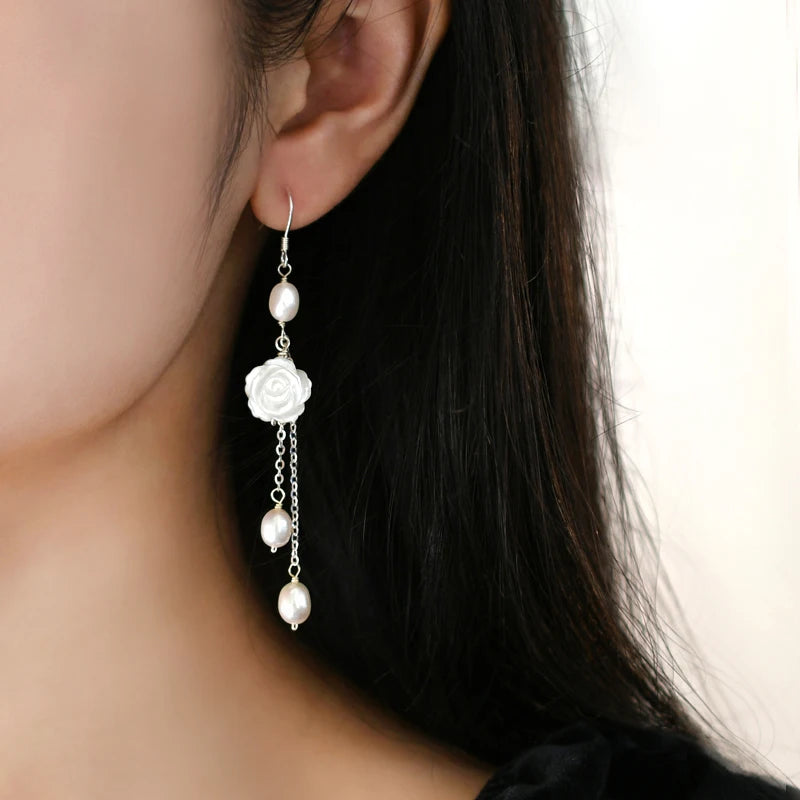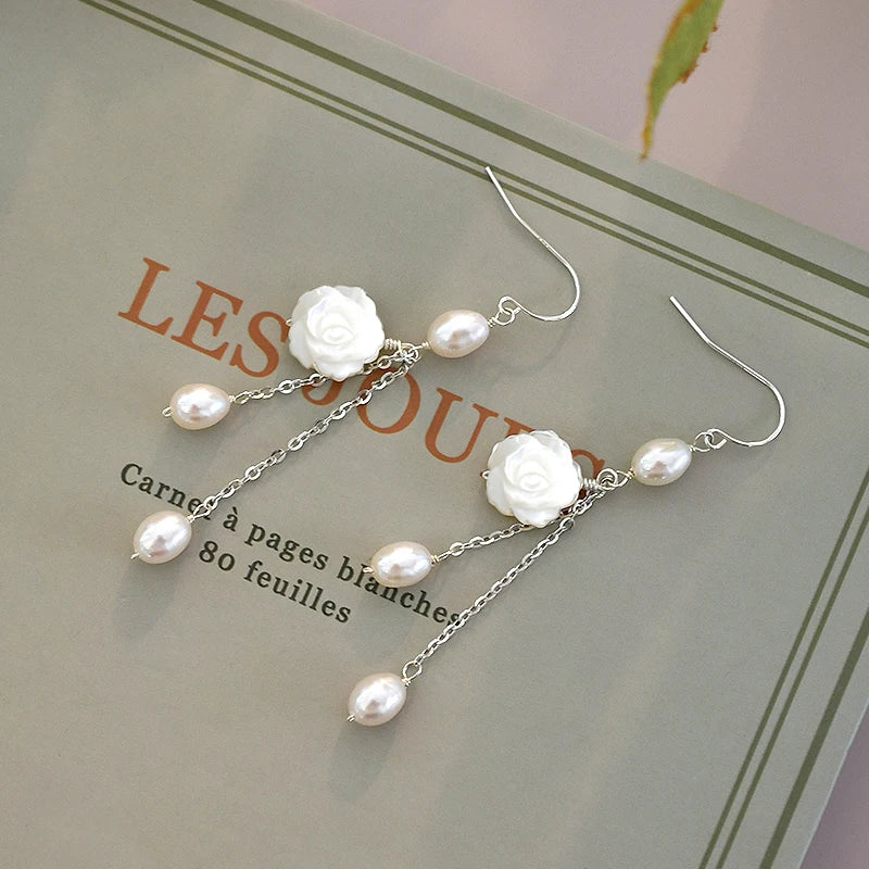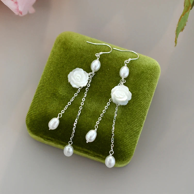 Add a touch of elegance with these beautiful 925 sterling silver long earrings featuring natural shell flowers. Perfect for a stylish and sophisticated look.