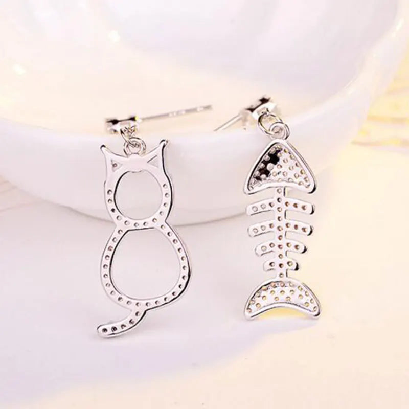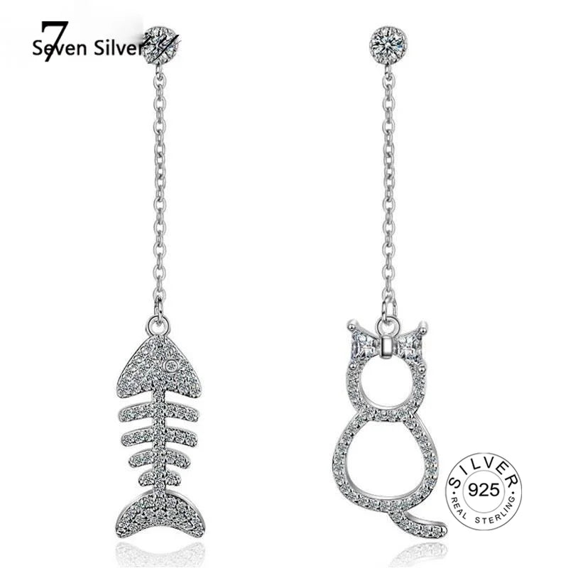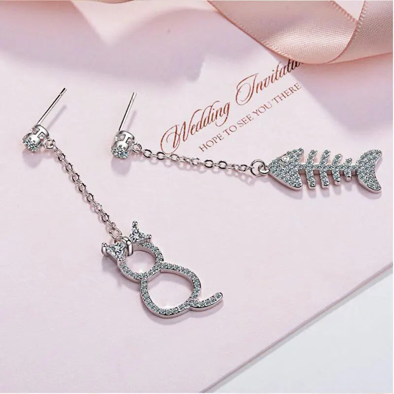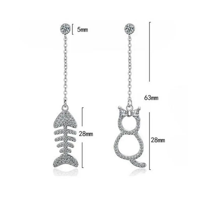 These stunning long tassel earrings are made of 925 sterling silver and feature a mosaic of CZ zirconia in a cat and fish design. Perfect for women who love unique jewelry pieces.