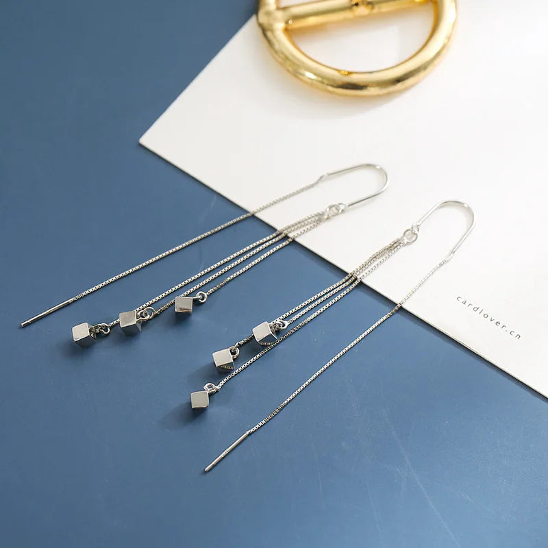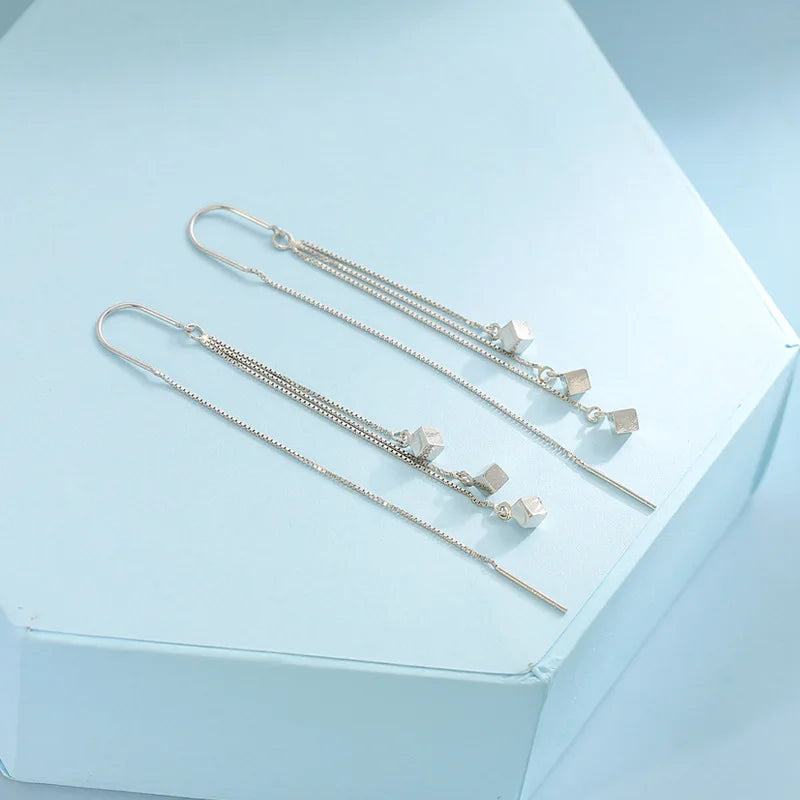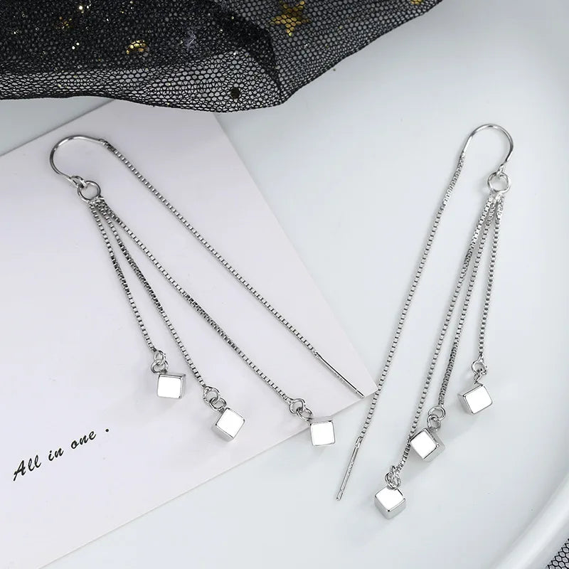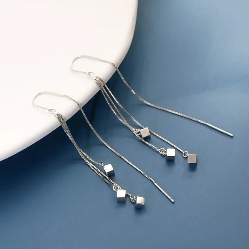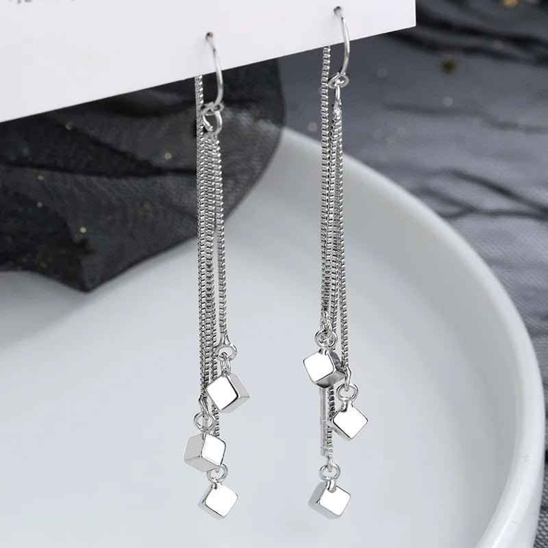 925 Silver Tassel Square Bead Drop Earring Party Jewelry