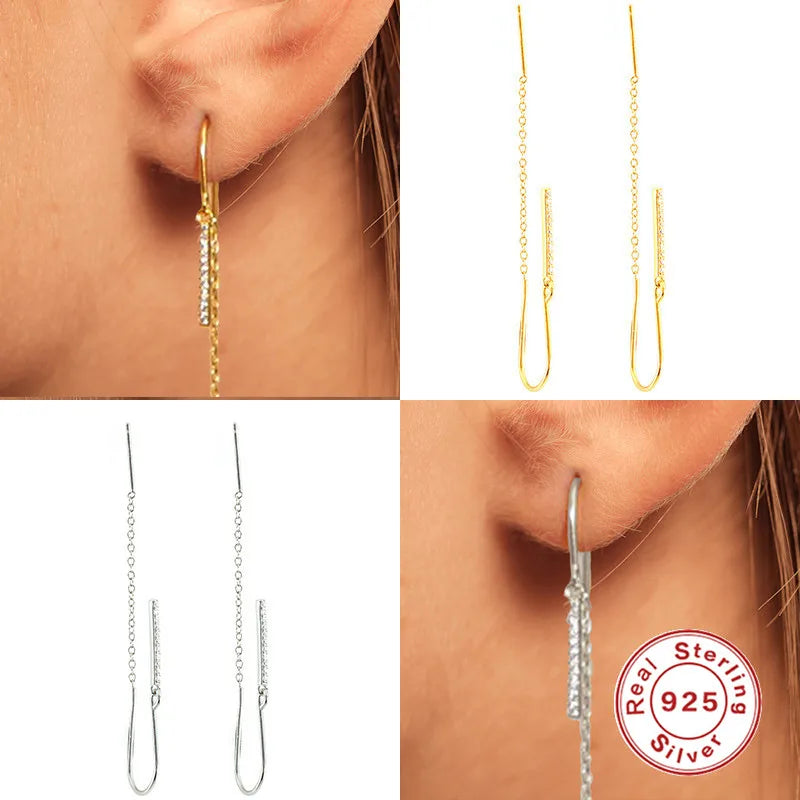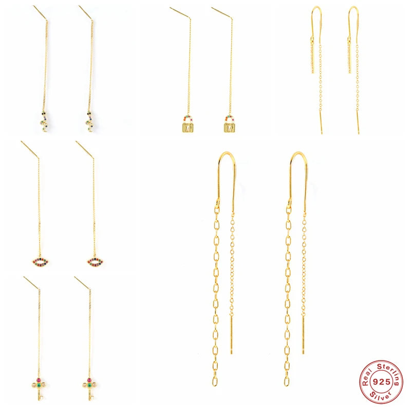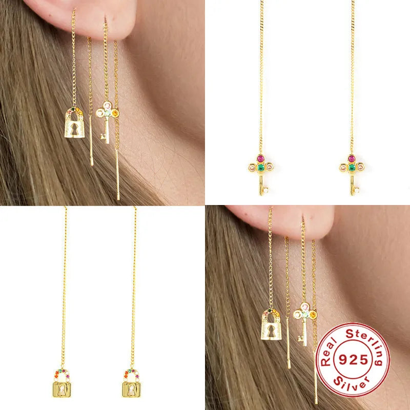 Elegant threader earrings featuring a long chain tassel design with colored zircon snake padlock key pendants. Crafted from 925 sterling silver, these earrings are perfect for adding a touch of style and sophistication to any outfit.