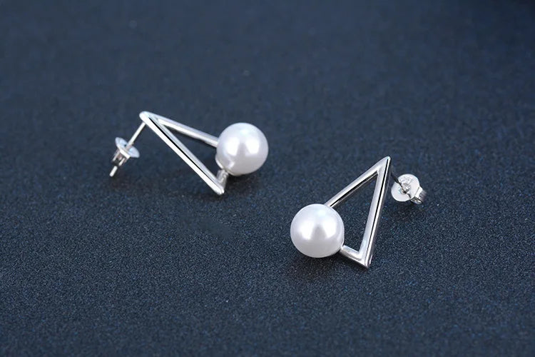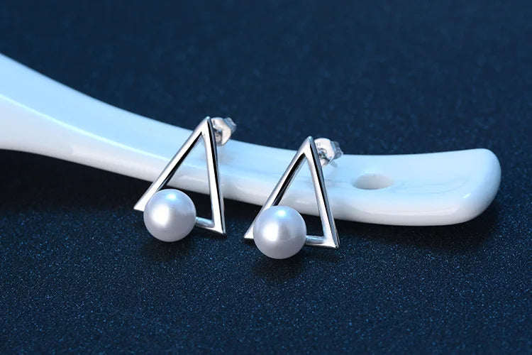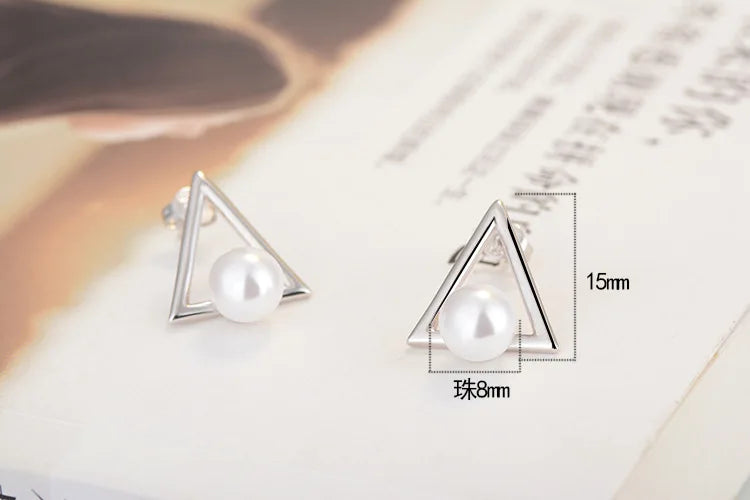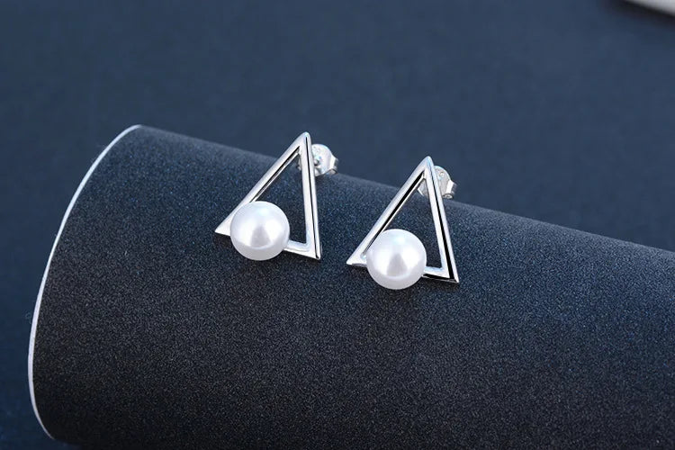 These elegant sterling silver stud earrings feature a triangle design with a lustrous pearl. Perfect for weddings, parties, or as a gift.