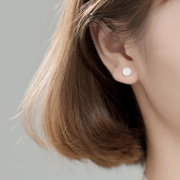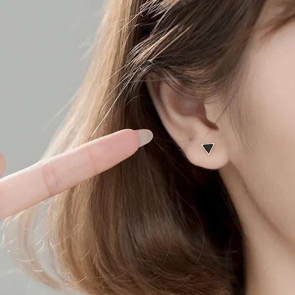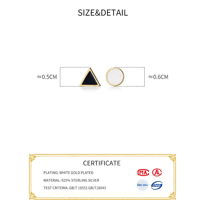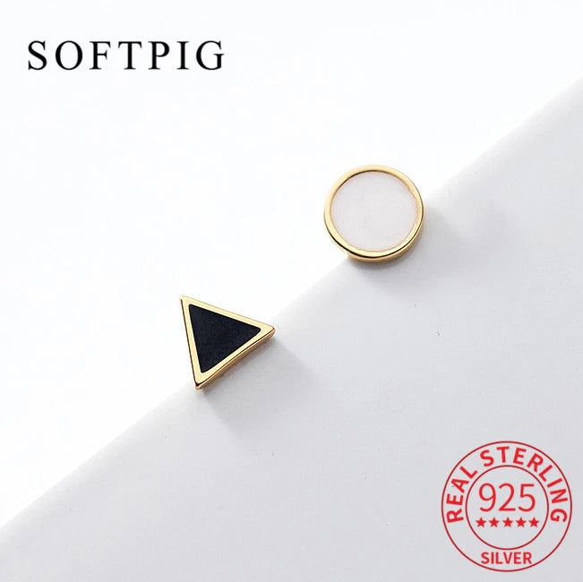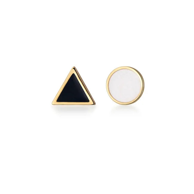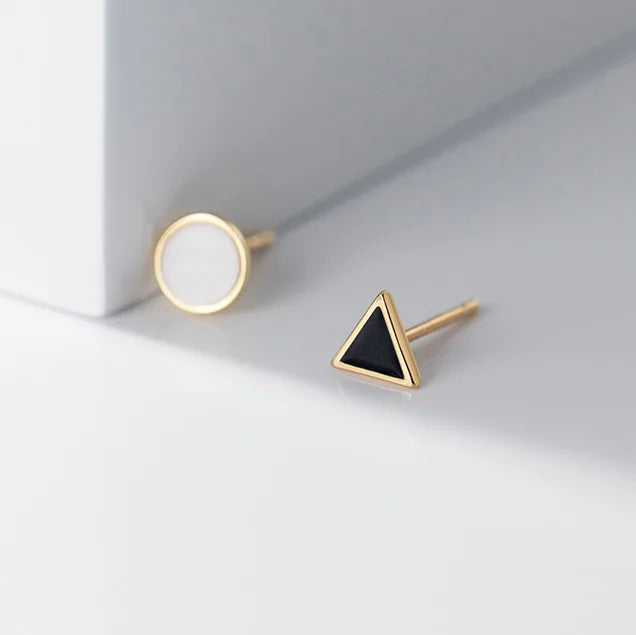 These sterling silver stud earrings feature a minimalist design with asymmetrical triangles and rounds. A perfect addition to any outfit for a touch of elegance.