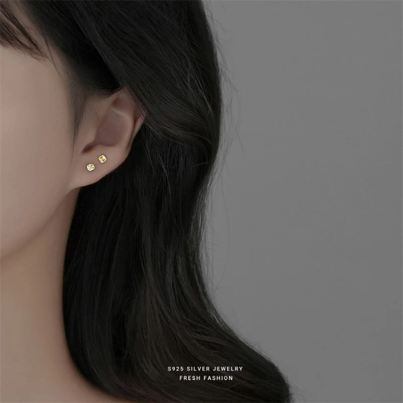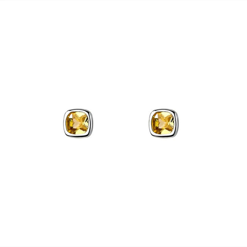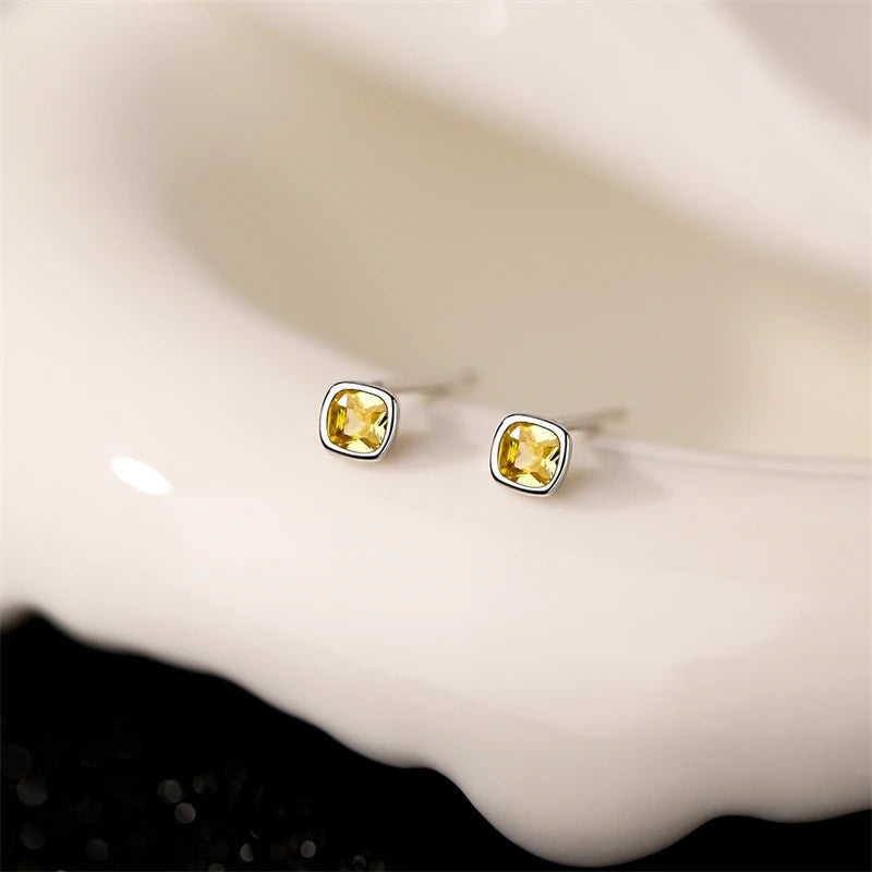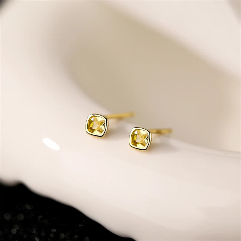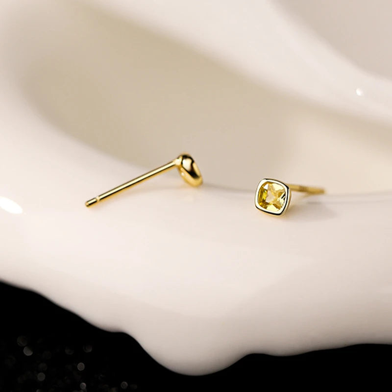 These mini stud earrings feature a geometric design with yellow zircon stones. Perfect for light wedding jewelry accessories.
