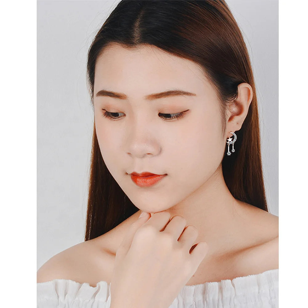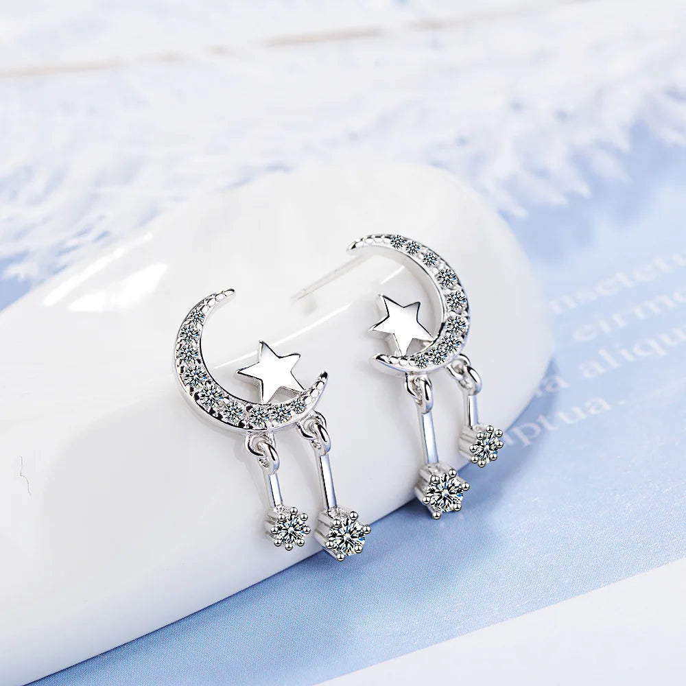 925 Silver Zircon Star Moon Tassel Stud Earrings Fine Jewelry