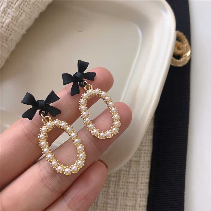 Black Bow Faux Pearl Stud Earrings Cute Vintage Party Jewelry
