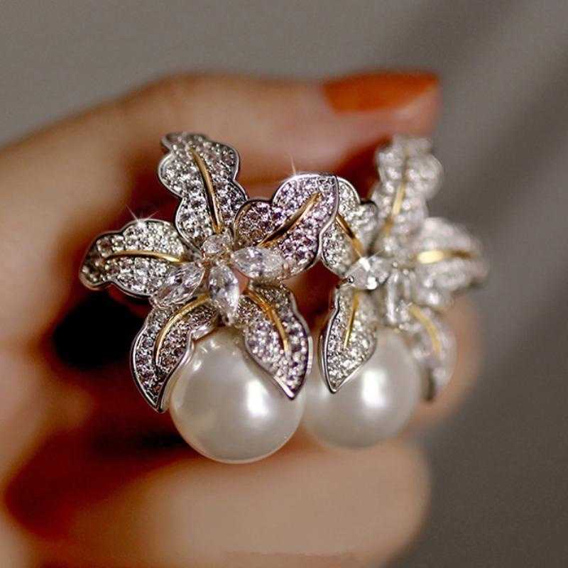 Chic Silver Plated Big Round Faux Pearl & CZ Flower Stud Earrings