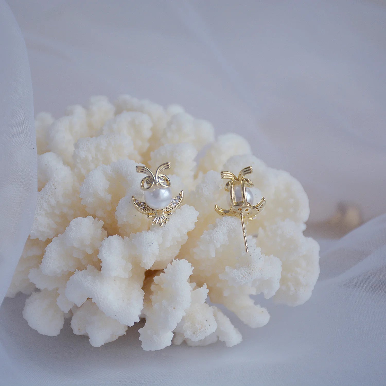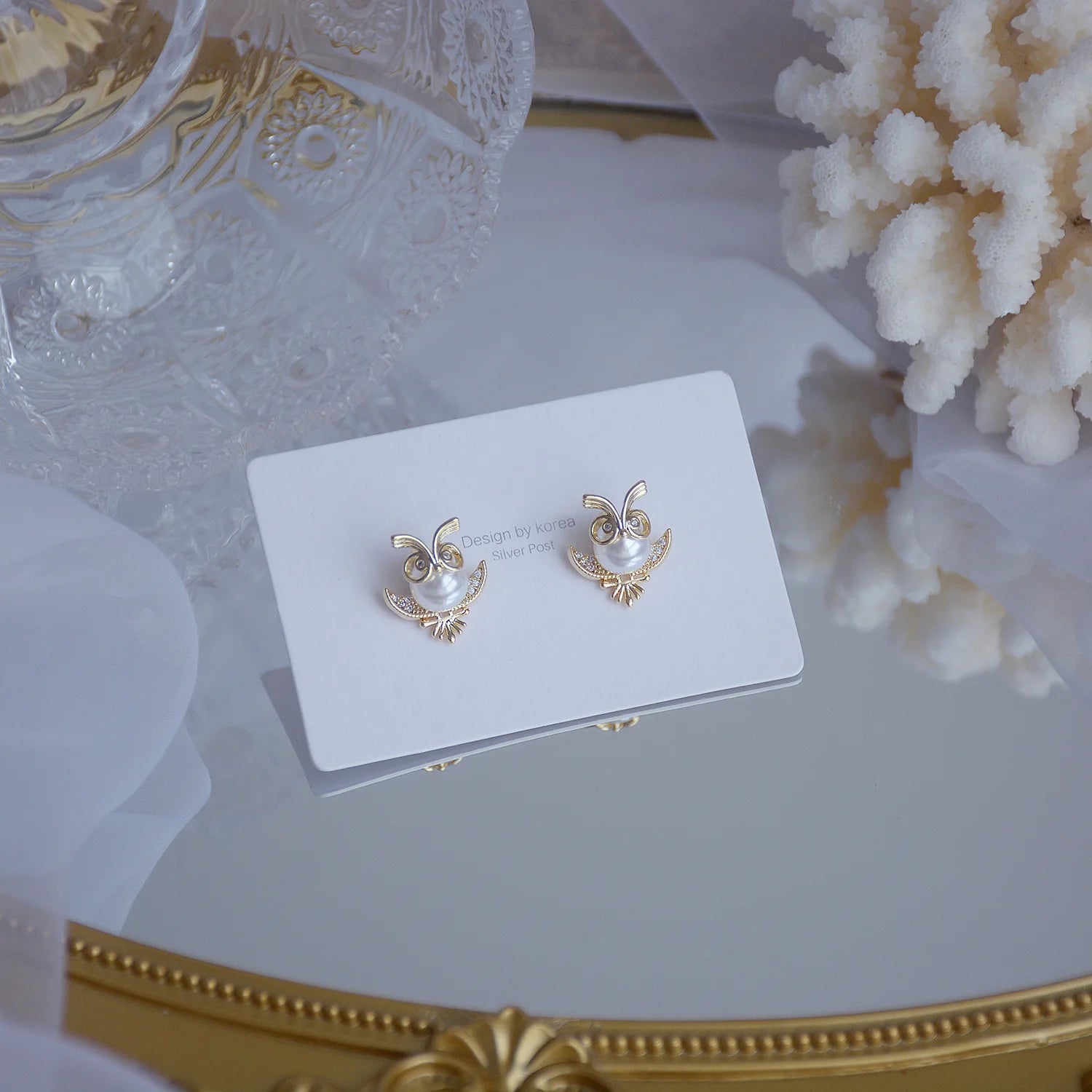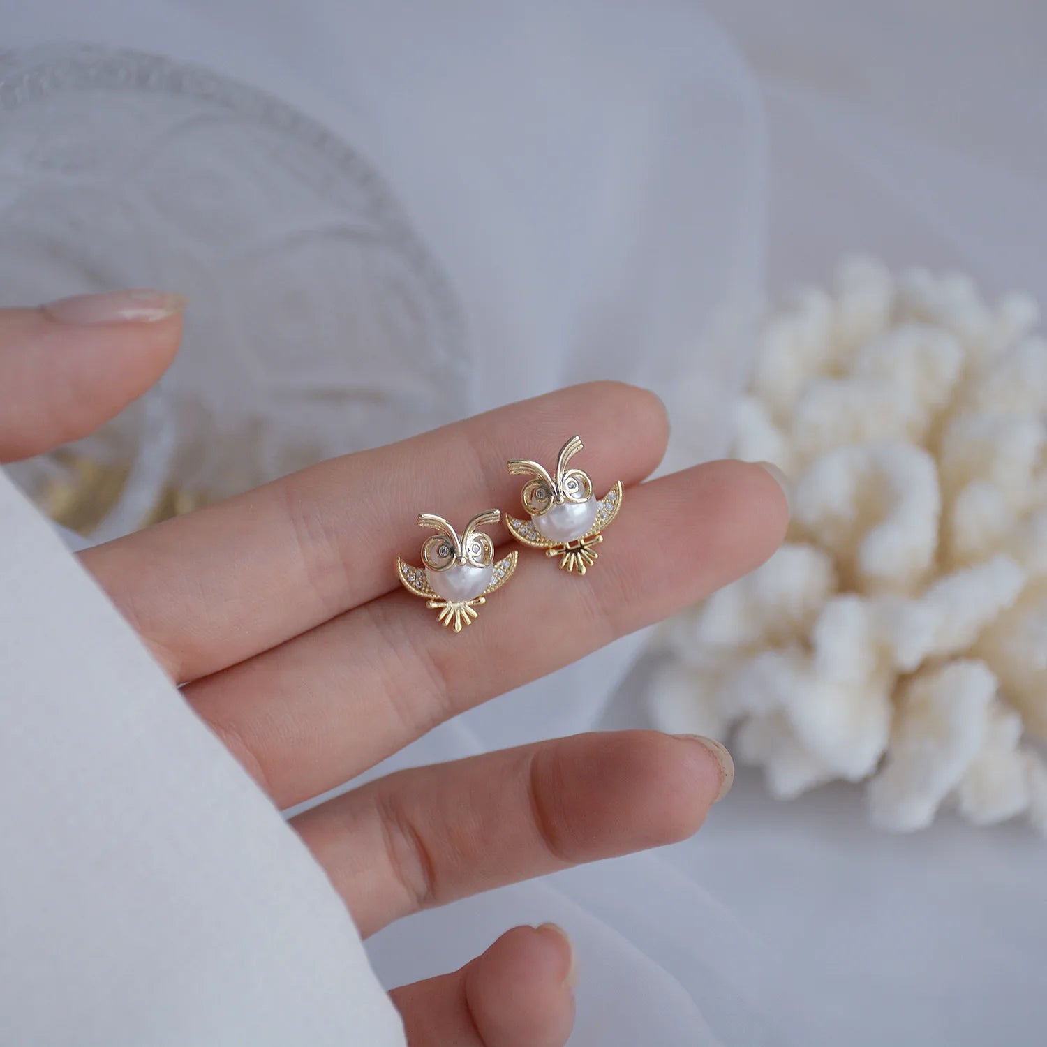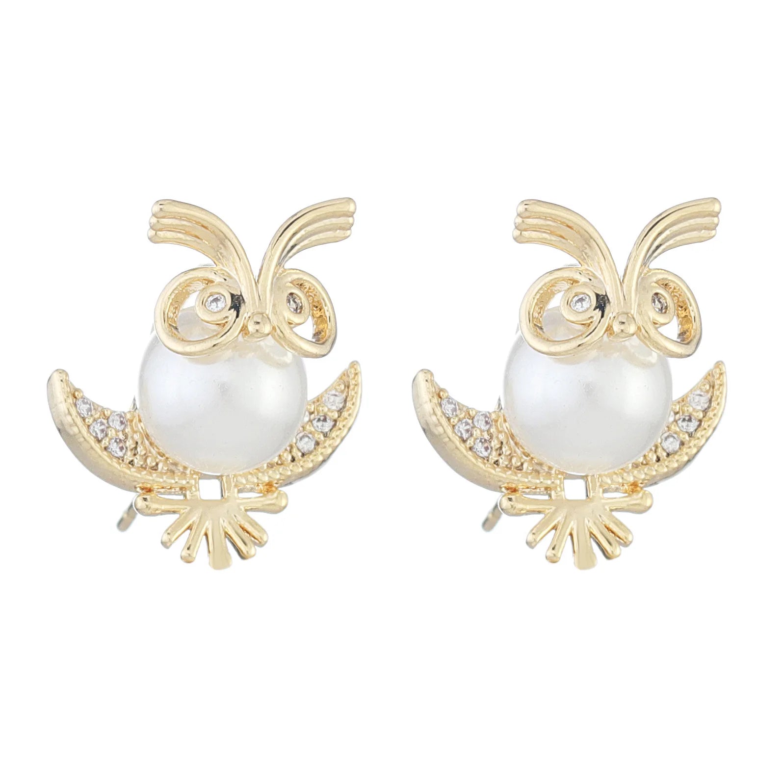 These stunning owl stud earrings feature a combination of crystals and pearls on a 14k gold plated base, perfect for adding a touch of elegance to your holiday party outfit.