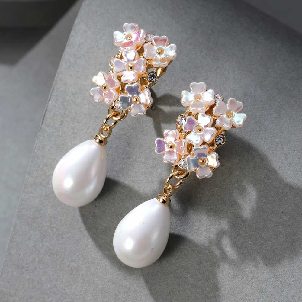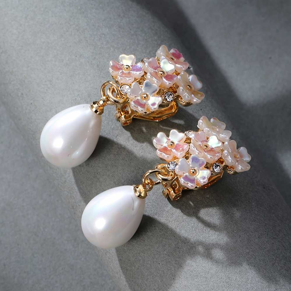 Elegant Clip On Earrings for Women Flower Design with Faux Pearl Drop
